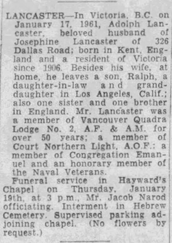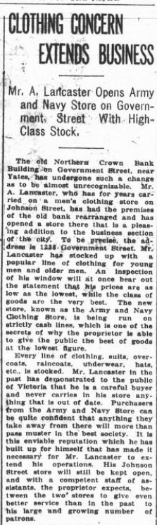Adolph first appeared in Victoria’s City Directory in 1908 and was listed as living at the same address as his uncle, Isador Lancaster and as clerk at Isador’s Clothing shop at 1323 Government Street. In 1909 the shop was listed as Army & Navy Clothing Store with Isador as the proprietor and Adolph as salesman. Adolph became the proprietor in 1910 when apparently his uncle moved to Vancouver. Isador returned to Victoria in 1915 and clerked for his nephew in the Army and Navy Store. In about 1915 Lancaster & Co was formed. 1917 with Isador as manager and Adolph as a worker. September 21, 1919 the British Colonist reported that Adolph opened a second men’s clothing store.