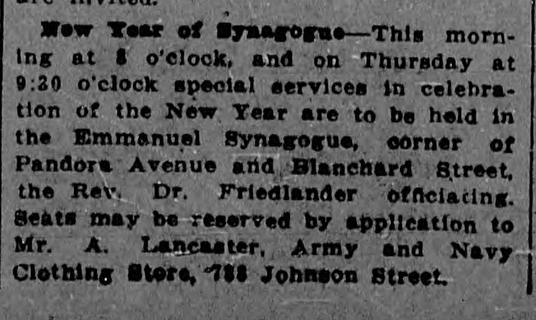 On September 9, 1911 the Victoria Daily Times reported that Adolph was elected Treasurer of Congregation Emanu-el at the annual meeting. In October, 1913 the British Colonist wrote that Rev. Dr. Elias Friedlander would be officiating at the High Holiday services and that tickets could be “reserved by application to Mr. A. Lancaster, Army & Navy Clothing Store.”