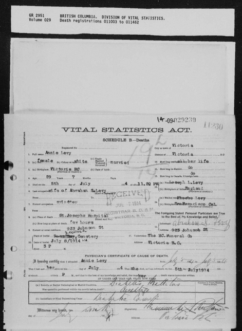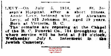 On July 5, 1914, while in Seattle, Annie became ill and died there at the age of 29. Her remains were brought to Victoria for burial between her mother and father.