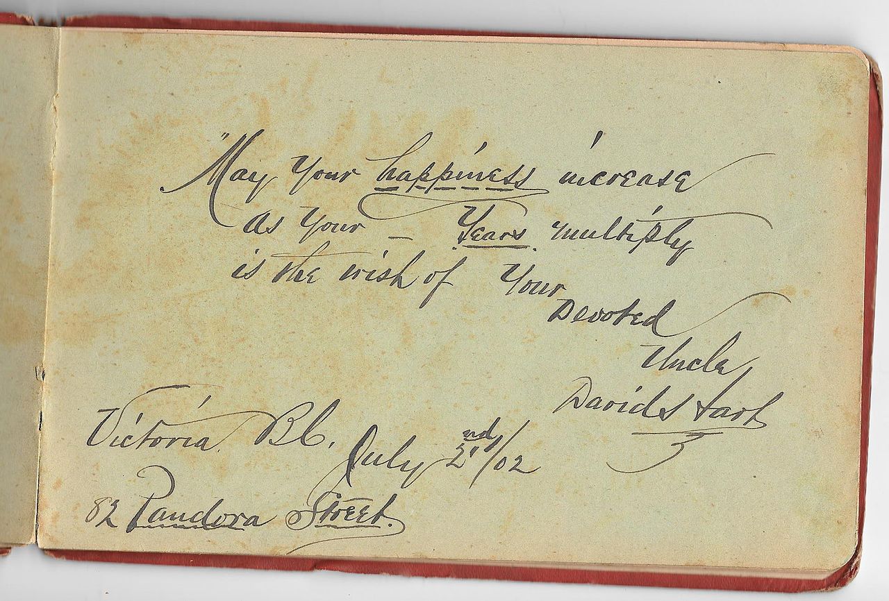 She kept an autograph album which was signed by friends and classmates. One entry reads: “the Gates Street shop where we worked…”the bosses aired their knowledge, but we didn’t care a cent.” Another wishes for her a gift of a broom for use in her future marriage and offers the following advice. “In sunshine use the brushy end, in stormy weather use the other!” The album is in the Special Collection in the University of Victoria archives.