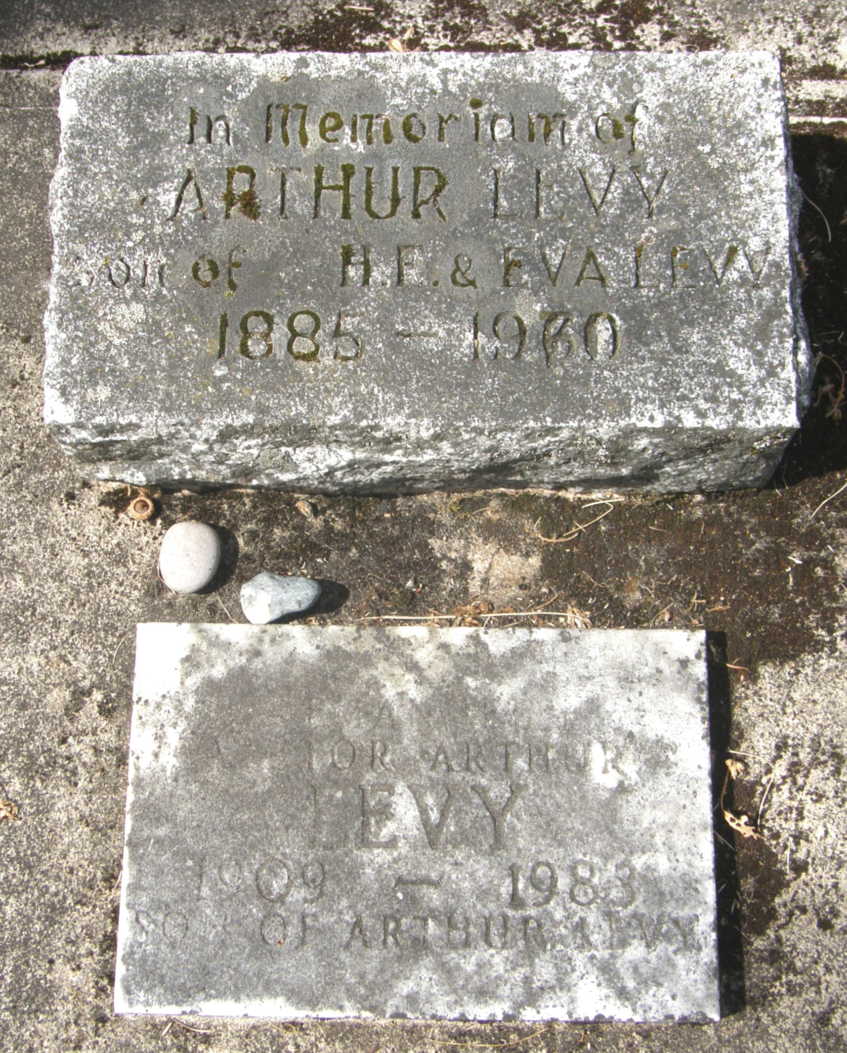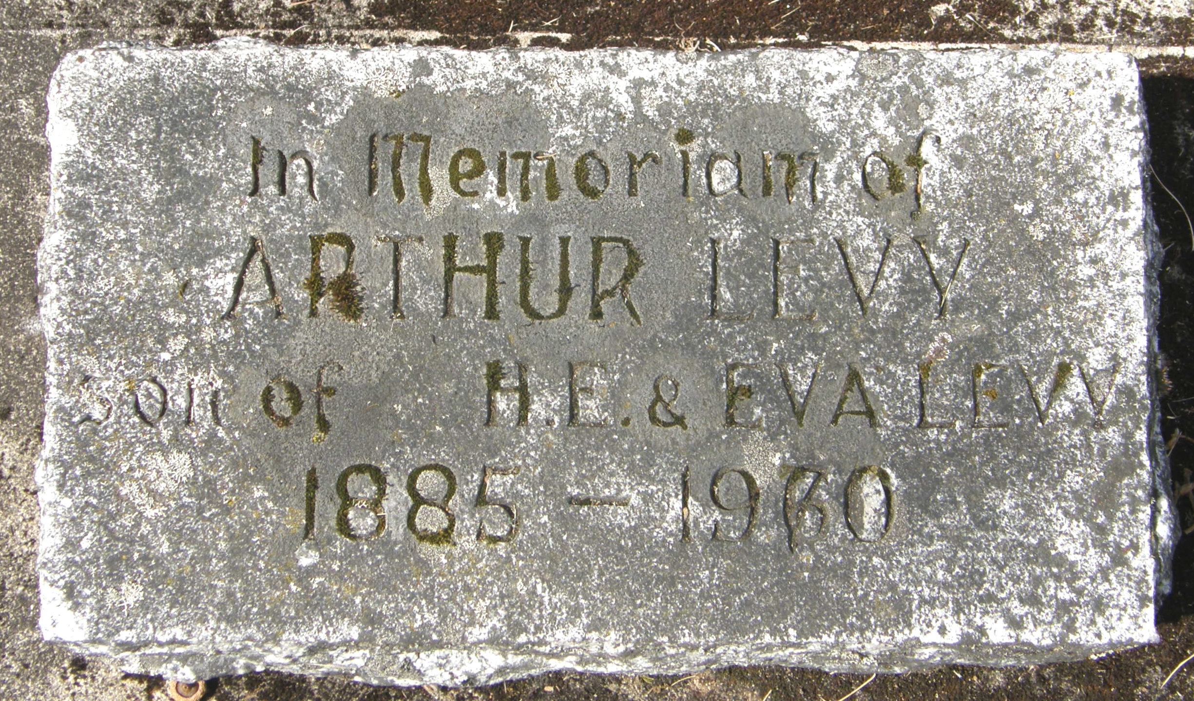 When Arthur Levy got his affairs in order, he inquired about having his burial plot near the family grave. However, there wasn’t room there so he was given a plot close to his aunt Phoebe and her family. Although Arthur Levy had no intentions of being buried, having a place in the Jewish Cemetery was important to him. To that end, he bought a headstone and had it placed in the cemetery. Thinking that he’d live to be as old as his father, a birth and death date were inscribed before the headstone was placed. However, Arthur Levy predeceased his prediction. Rather than ordering a new stone, the date of his death was etched on top of the existing date.