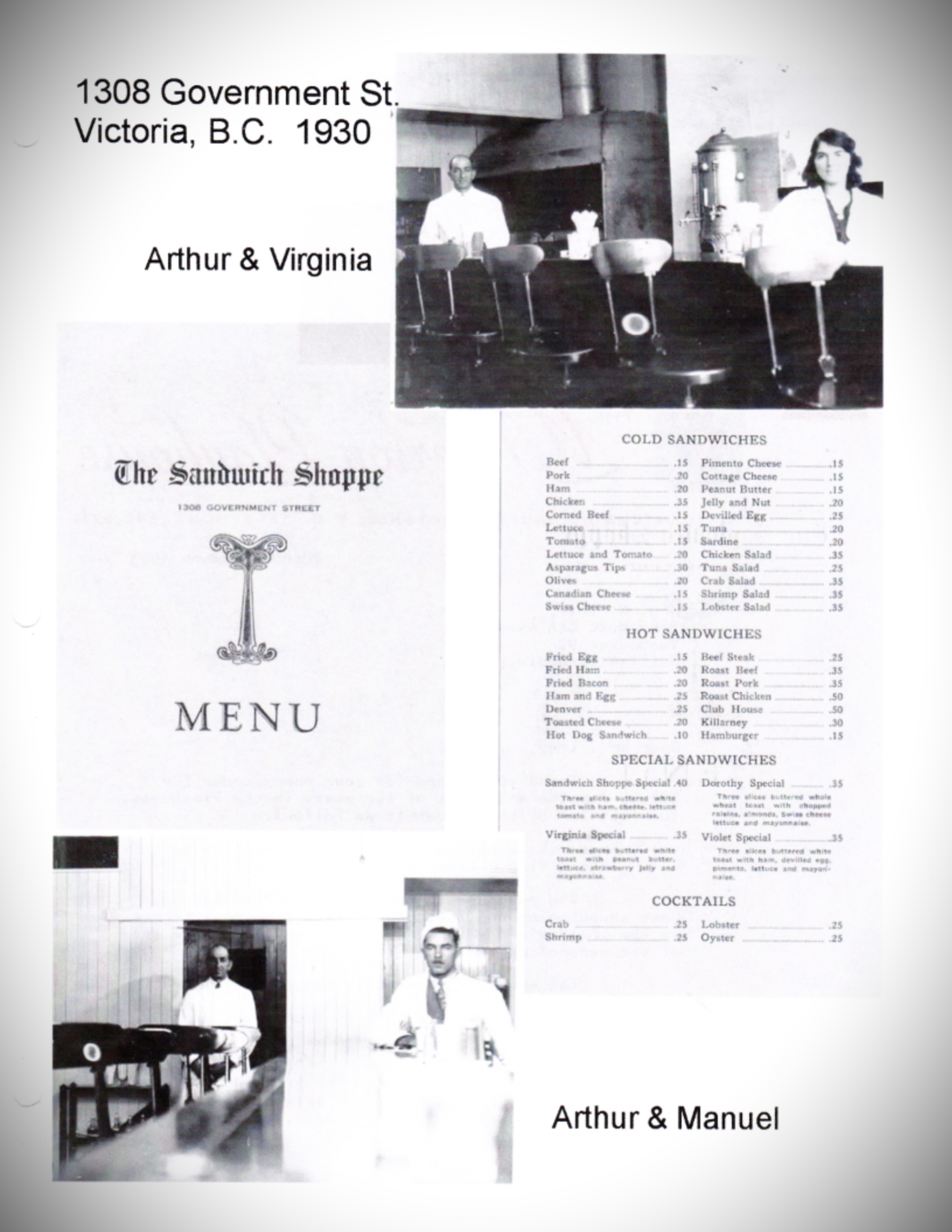 Arthur Levy was born in Seattle in 1885 to Henry Emanuel (H.E.) Levy and Eva Rostein Levy. The family moved to Victoria when Arthur was 4. Arthur Levy took over the infamous Levy’s Restaurant when his father retired. He closed the restaurant in 1914 and opened the Sandwich Shoppe which soon became a local hangout. Arthur named the daily specials after his family members.