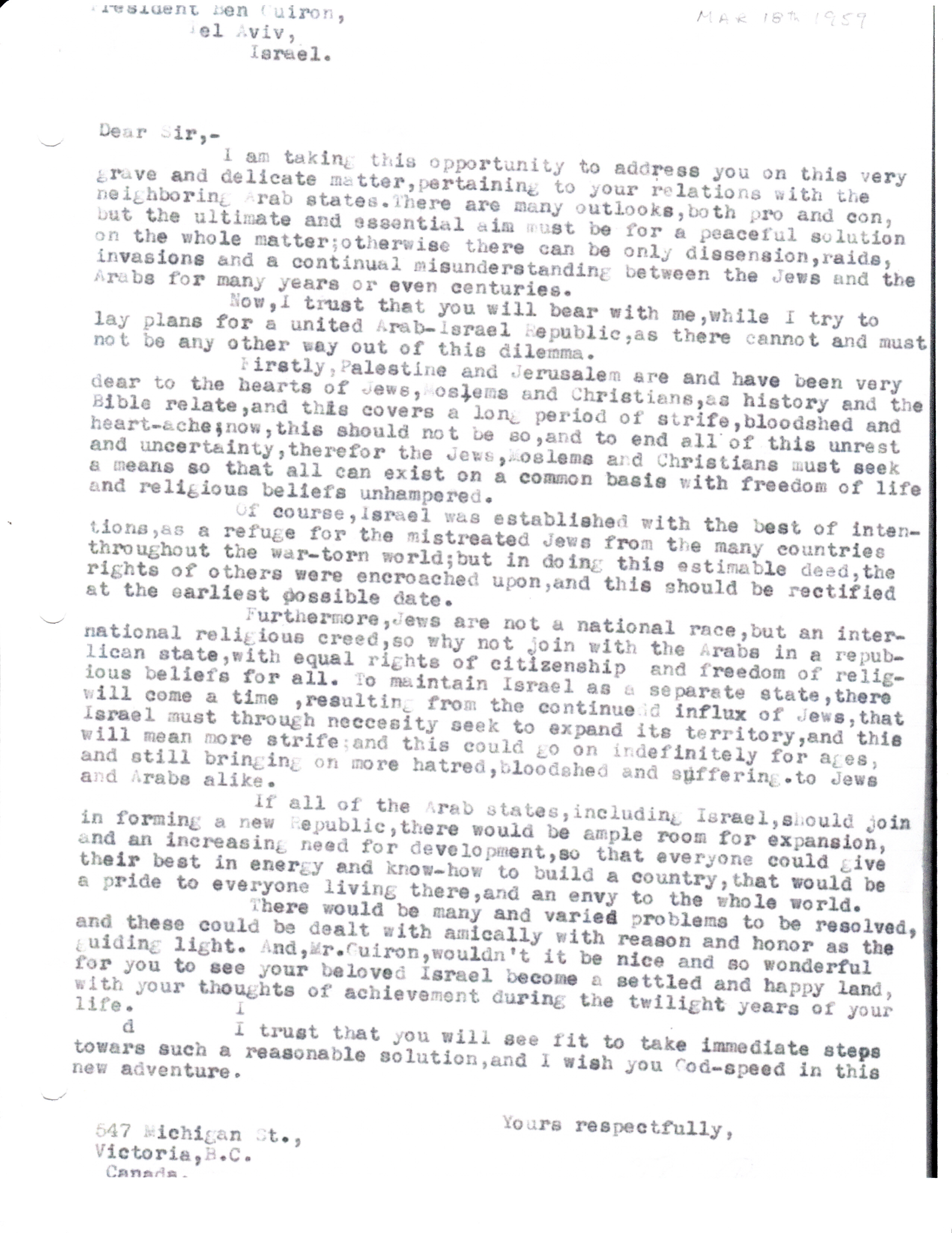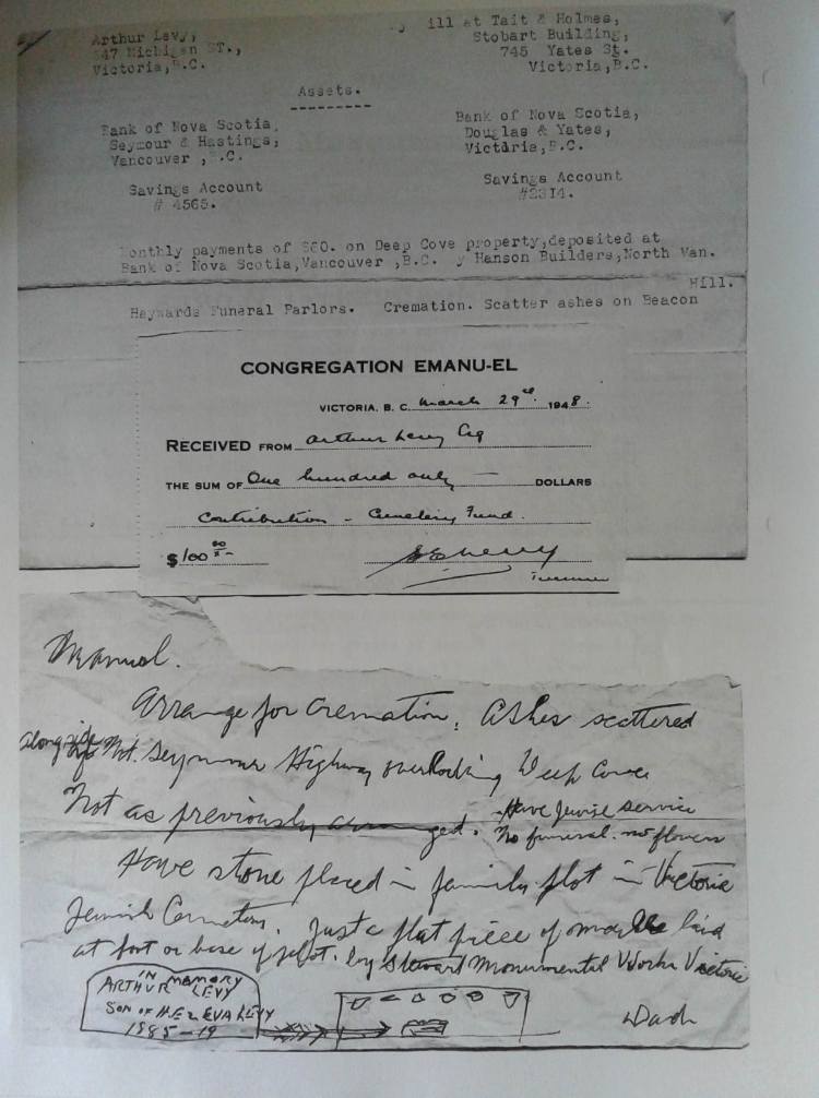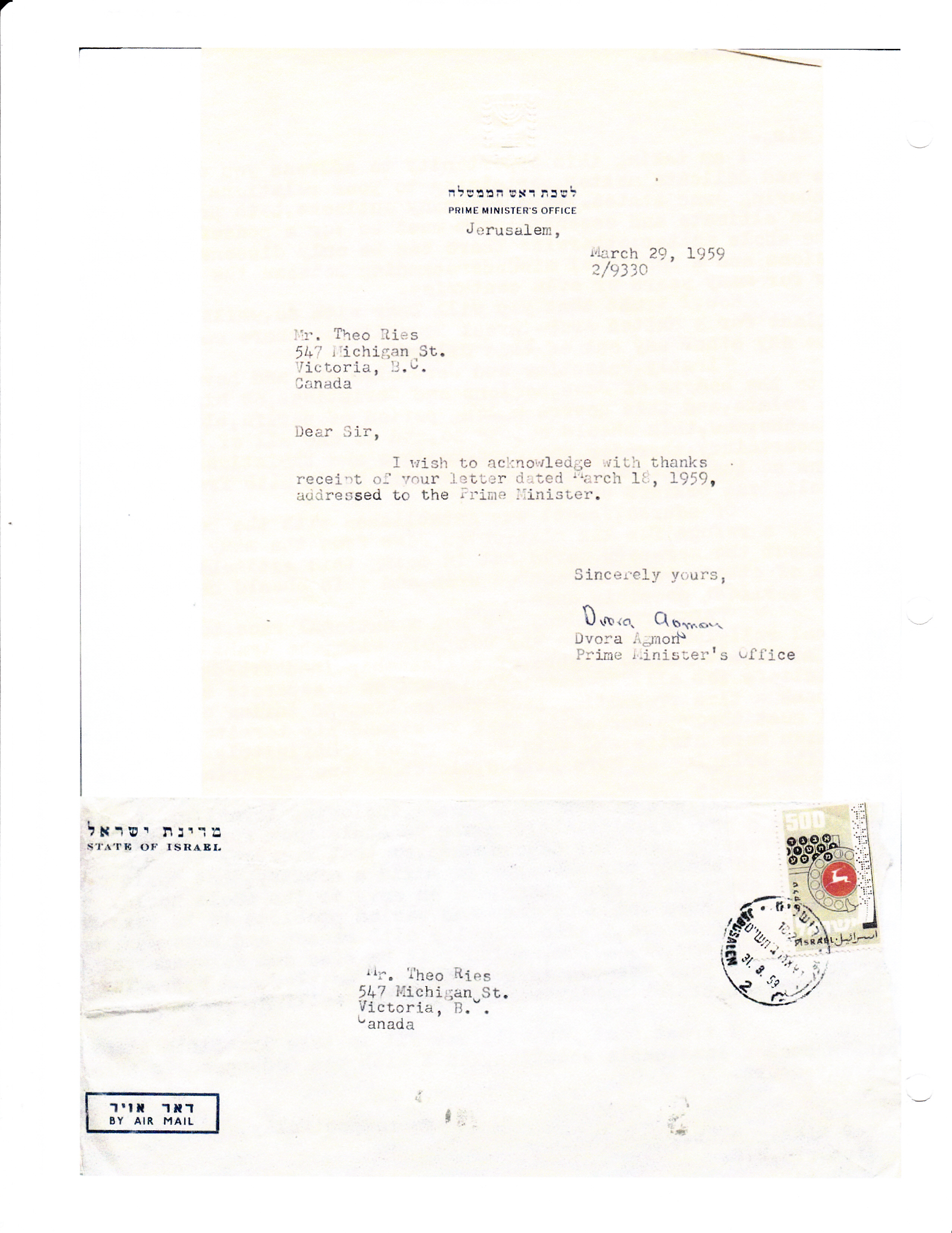 In retirement Arthur Levy devoted himself to fulfilling his dream of world peace. Letter writing became his passion. Under the nom-de-plume Theo Ries, he wrote to heads of state, urging cooperation. Among the cards he received were notes from Nasir Arafat and David Ben-Gurion. He was constantly writing to newspapers on a wide range of topics, including the idea of having cruise ships dock at Ogden Point. Although his letters were sometimes rejected, he campaigned tirelessly for peace for 17 years.