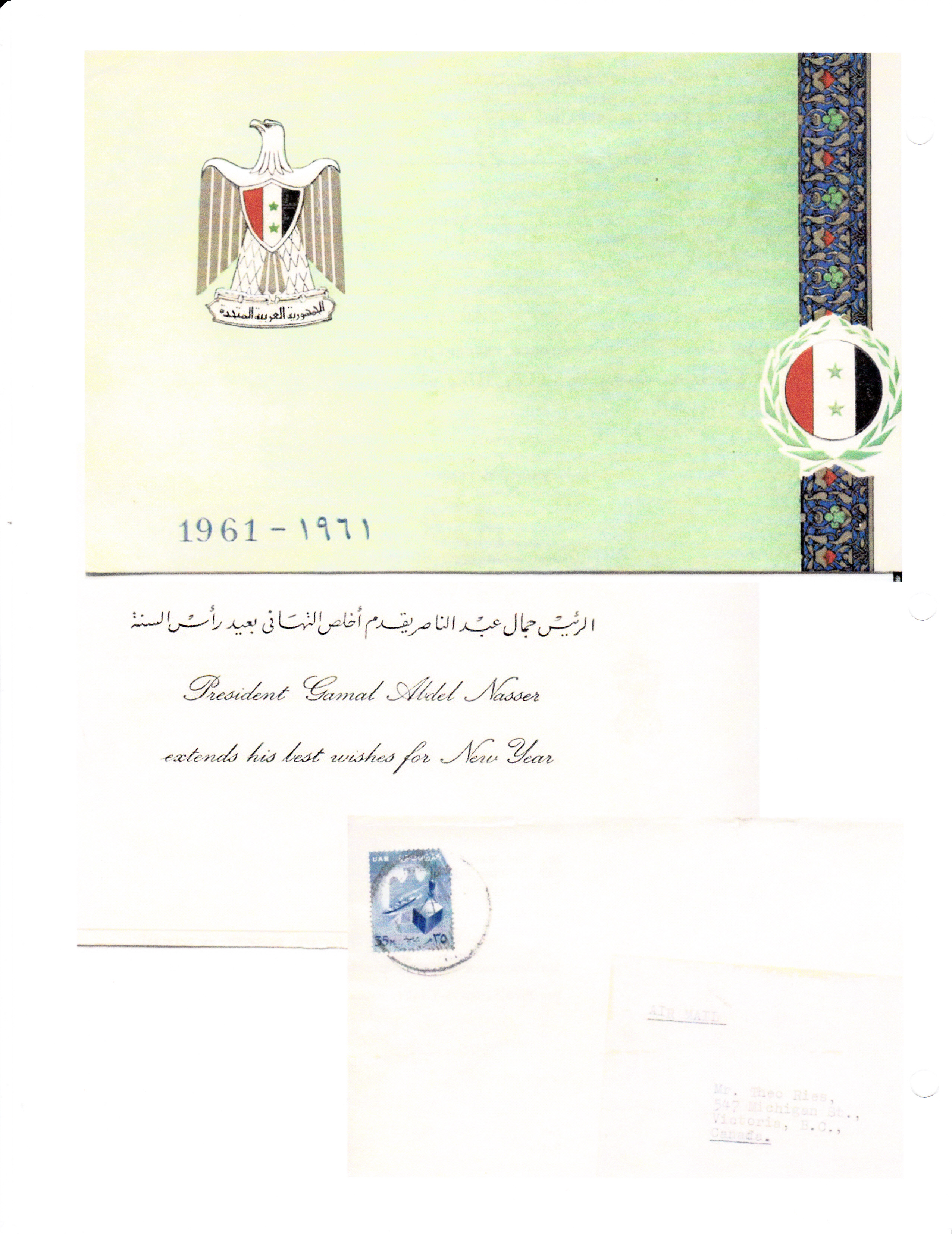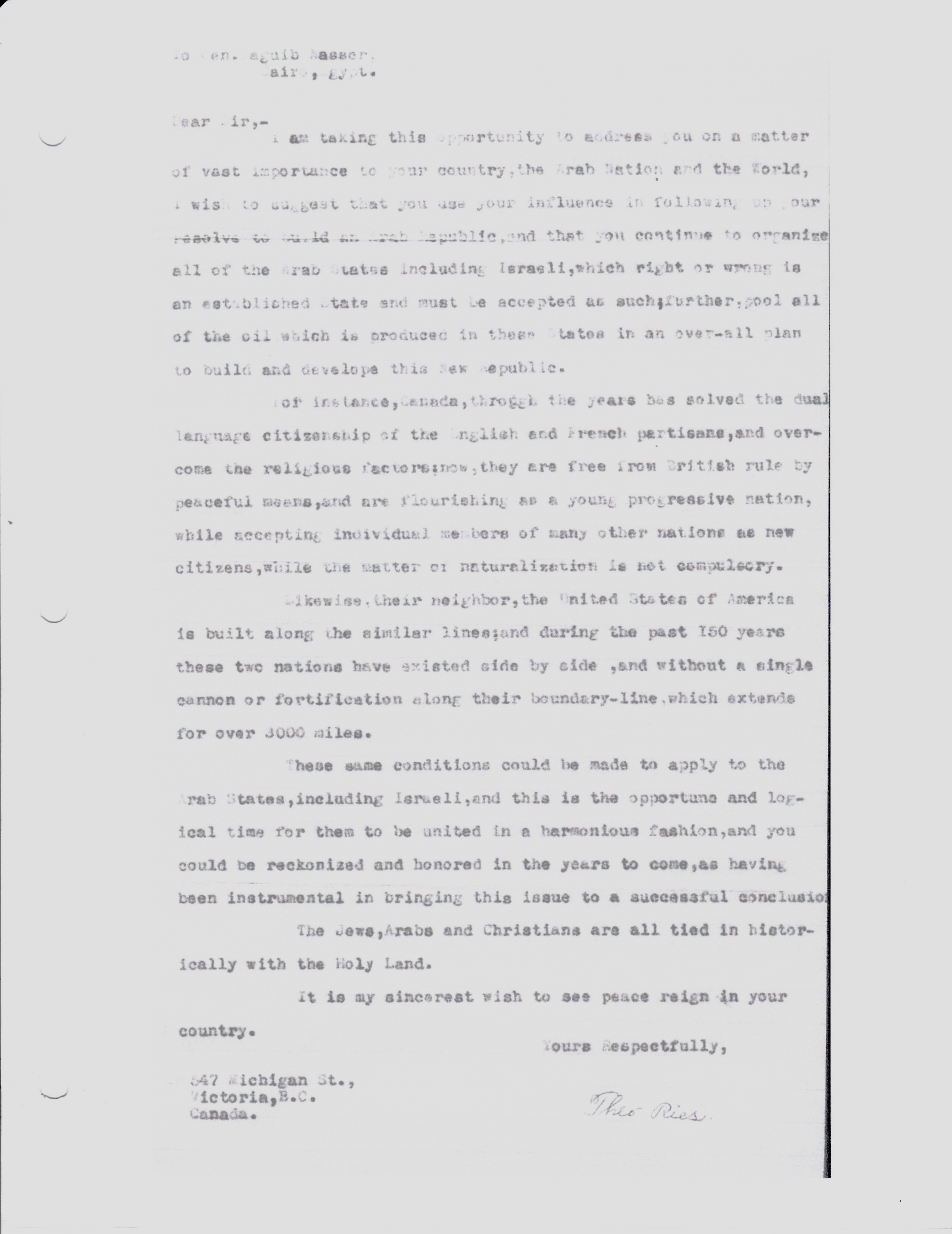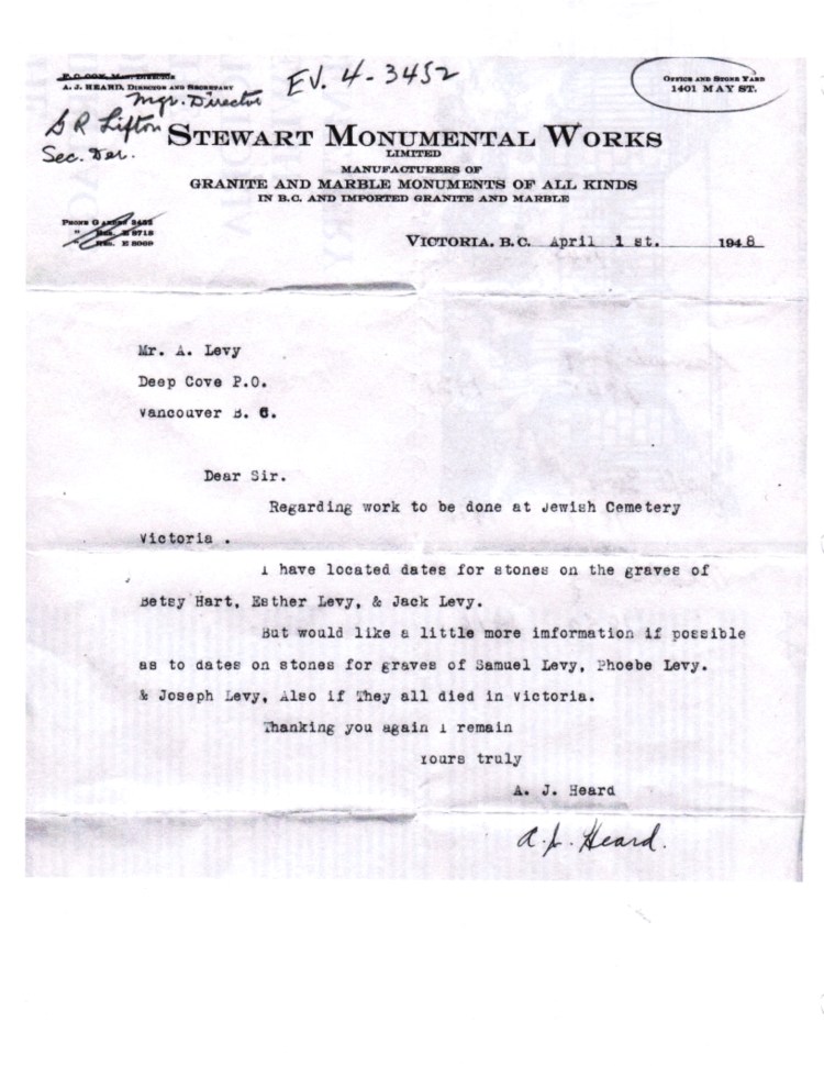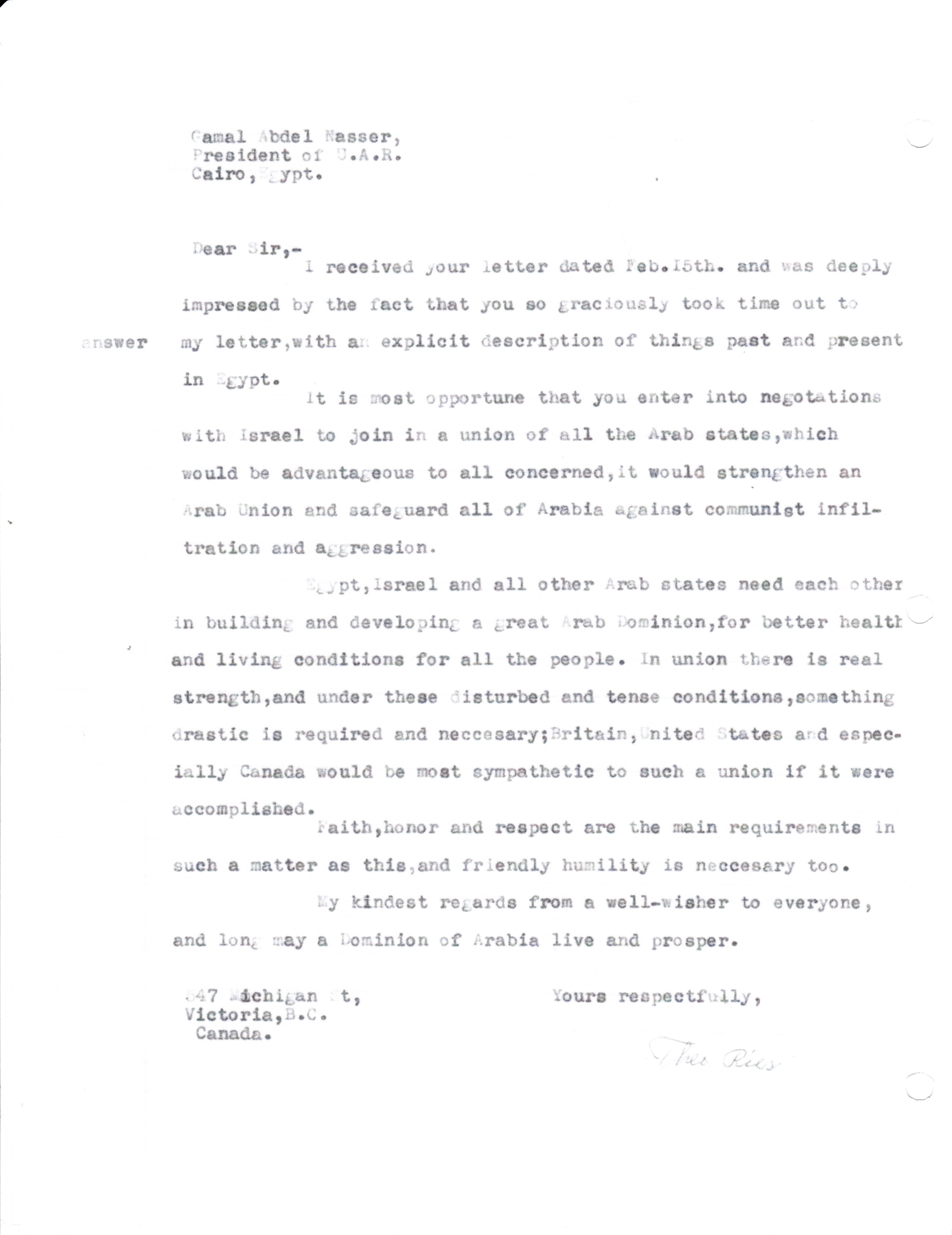In retirement Arthur Levy devoted himself to fulfilling his dream of world peace. Letter writing became his passion. Under the nom-de-plume Theo Ries, he wrote to heads of state, urging cooperation. Among the cards he received were notes from Nasir Arafat and David Ben-Gurion. He was constantly writing to newspapers on a wide range of topics, including the idea of having cruise ships dock at Ogden Point. Although his letters were sometimes rejected, he campaigned tirelessly for peace for 17 years.