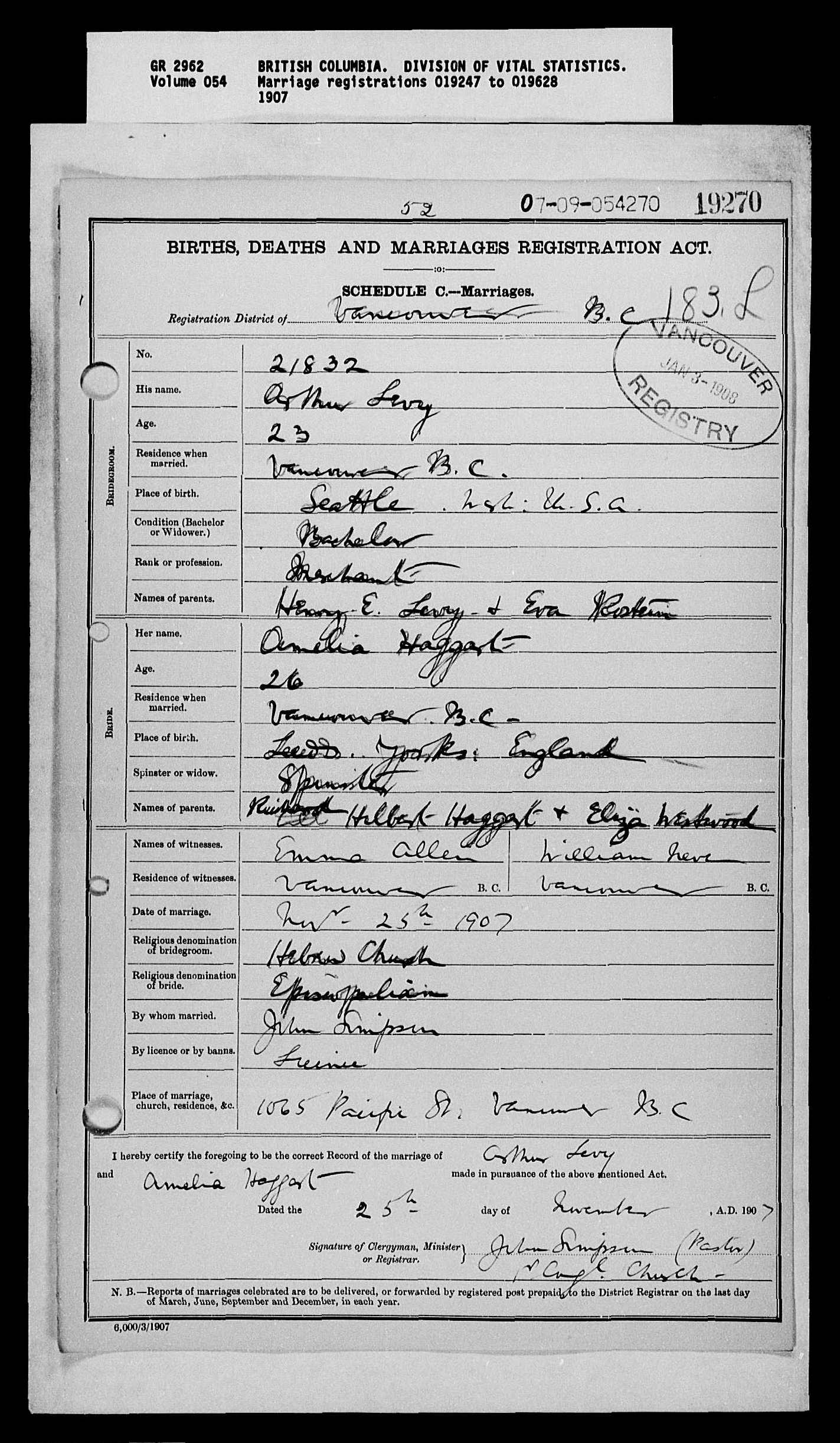 While in Nanaimo, Arthur Levy met Amelia-Violet Hilbert. Amelia-Violet Hilbert, who preferred to be called Violet, was a member of the Church of England and a divorcee with a daughter. When the relationship with Arthur Levy became serious, daughter Dorothy Haggart, was left in the care of Violet’s sister.