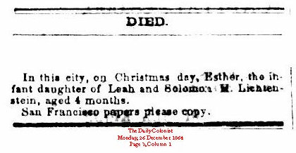 The information confirming the burial and biographical details is from Congregation Emanu-El Burial Register 1861 – 1866 as related through the JewishGen Online Worldwide Burial Registry (JOWBR), and the Daily Colonist / born San Francisco 1855 according to 1861-1866 burial register