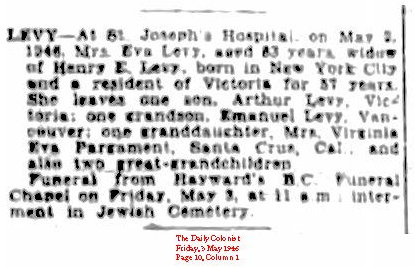 Eva was a music teacher. Her piano was shipped from New York around Cape Horn, South America to Seattle and then to Victoria. It has stayed in the family and is now in the possession of Eva’s great grand-daughter, Diana Levy Lofstrom.