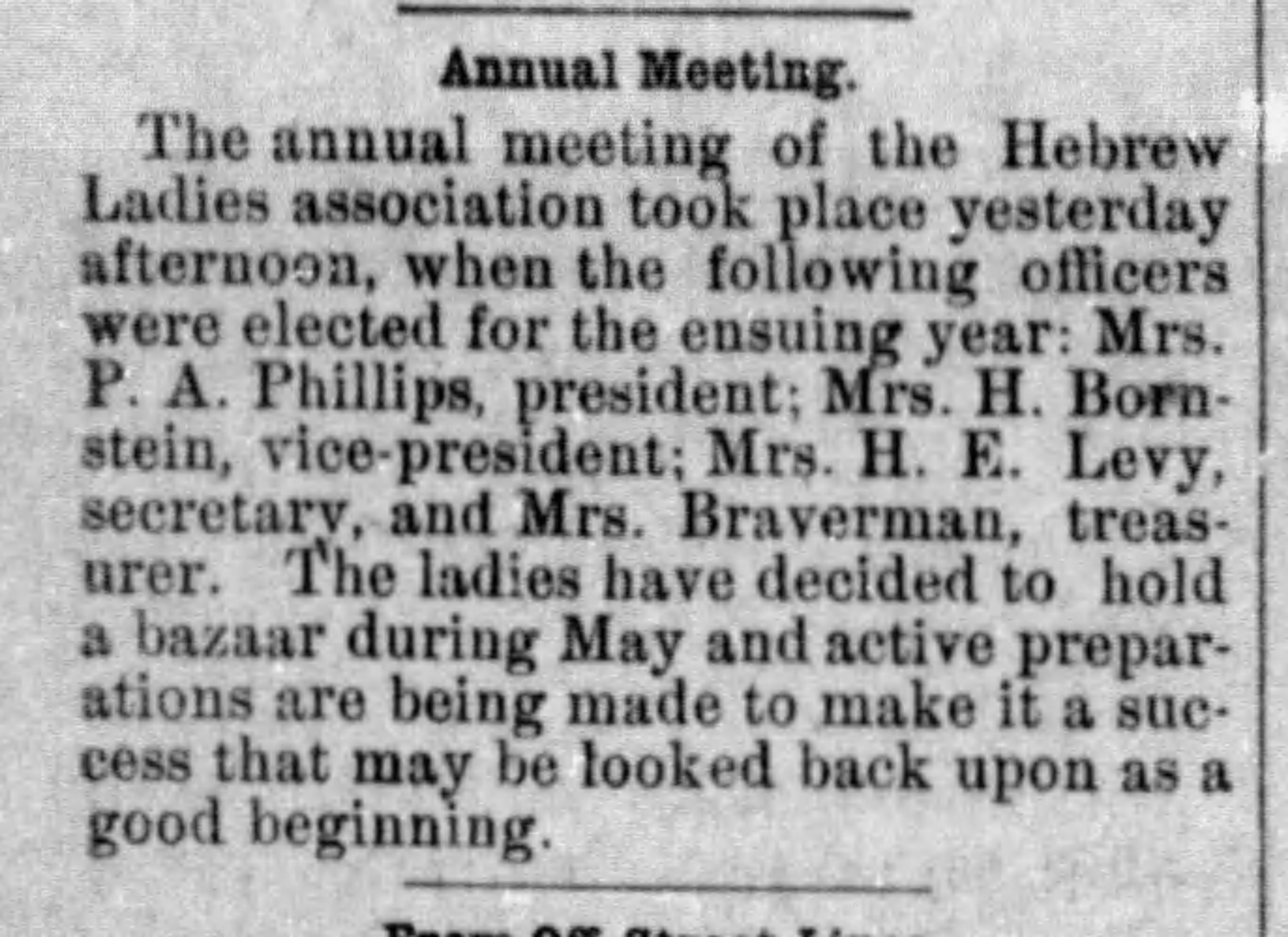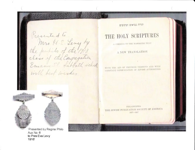 Eva was also an active member of the Hebrew Ladies Society. She held many positions and in 1894 was recognized by the membership with a gift of a gold medallion engraved with “E.L” and a chain. Her name appears on a 1896 Hebrew Ladies Society membership list. The Hebrew Ladies dissolved into the Women’s Auxiliary. Eva was president of Aux No. 6 and was given a silver metal pin in 1916 (shown above).