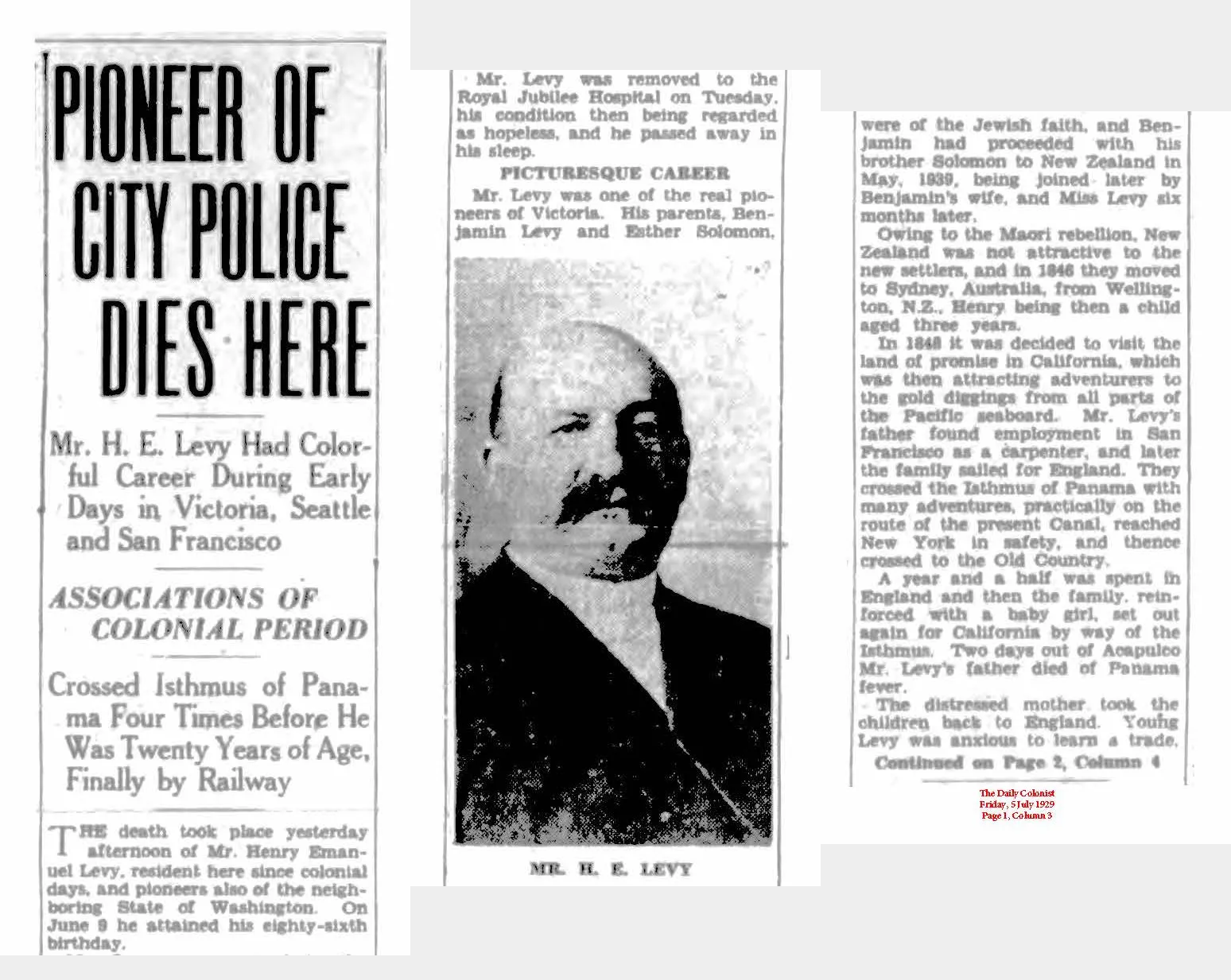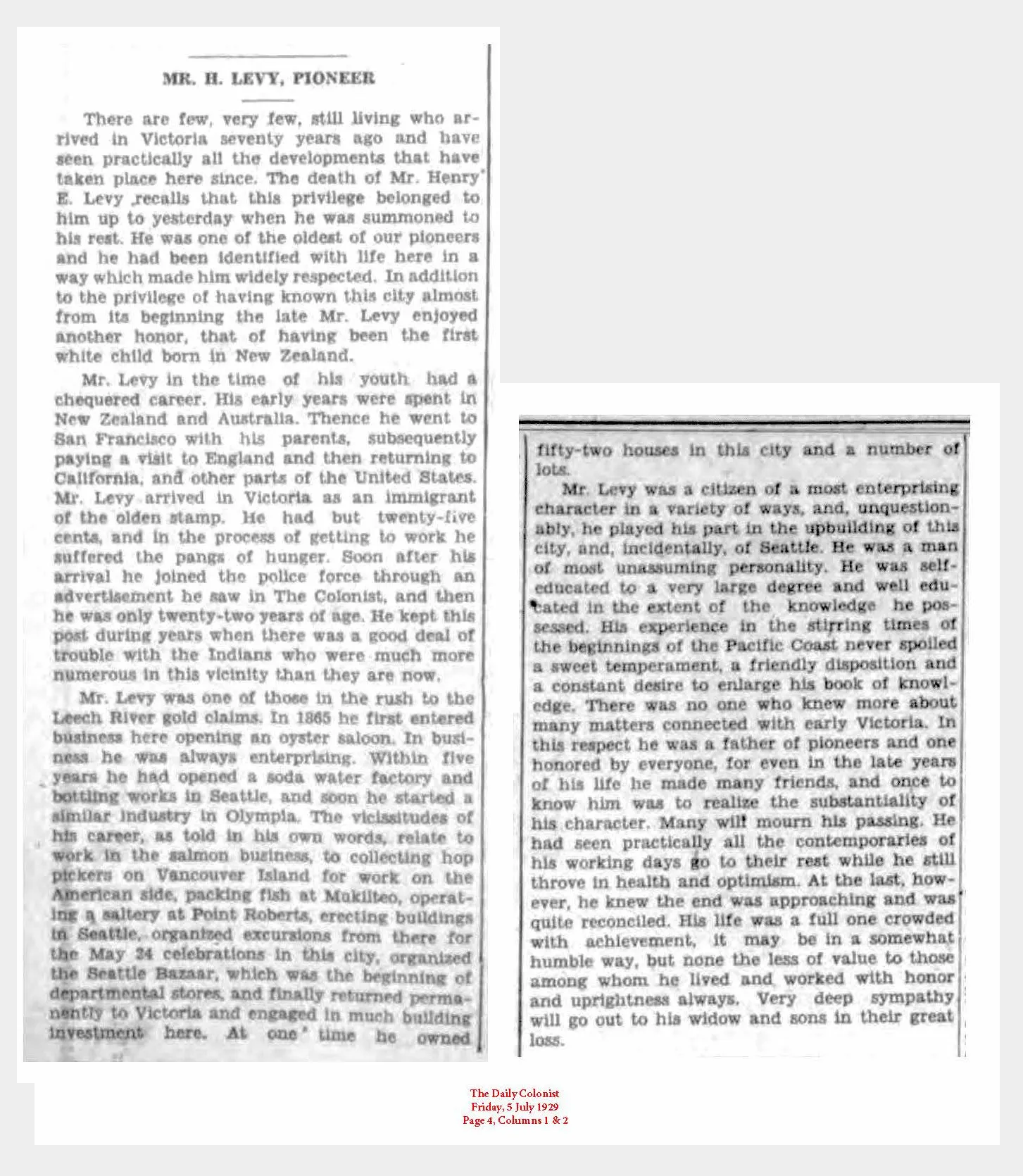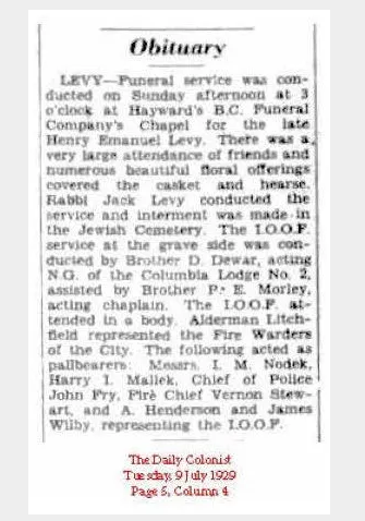 Success in business left H.E. Levy a wealthy man. According to the Daily Colonist on November 3, 1929, H.E. left an estate valued at $19,212. He and his family lived comfortably at 1022 Pemberton Road. The house still stands. He drove one the first motorcars in town; a two cylinder Maxwell.