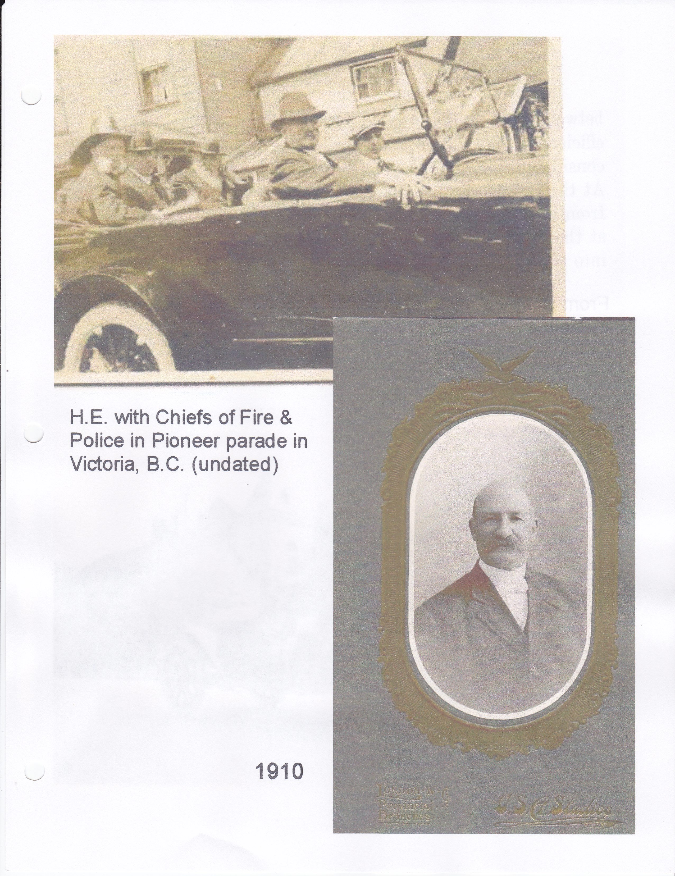 In 1863 H.E. became a member of the Victoria Fire Department. He volunteered with the Tiger Engine Company and would later serve as an officer. A member of the Fire Wardens of Victoria and Chiefs of both the Fire and Police departments were pallbearers at his funeral.