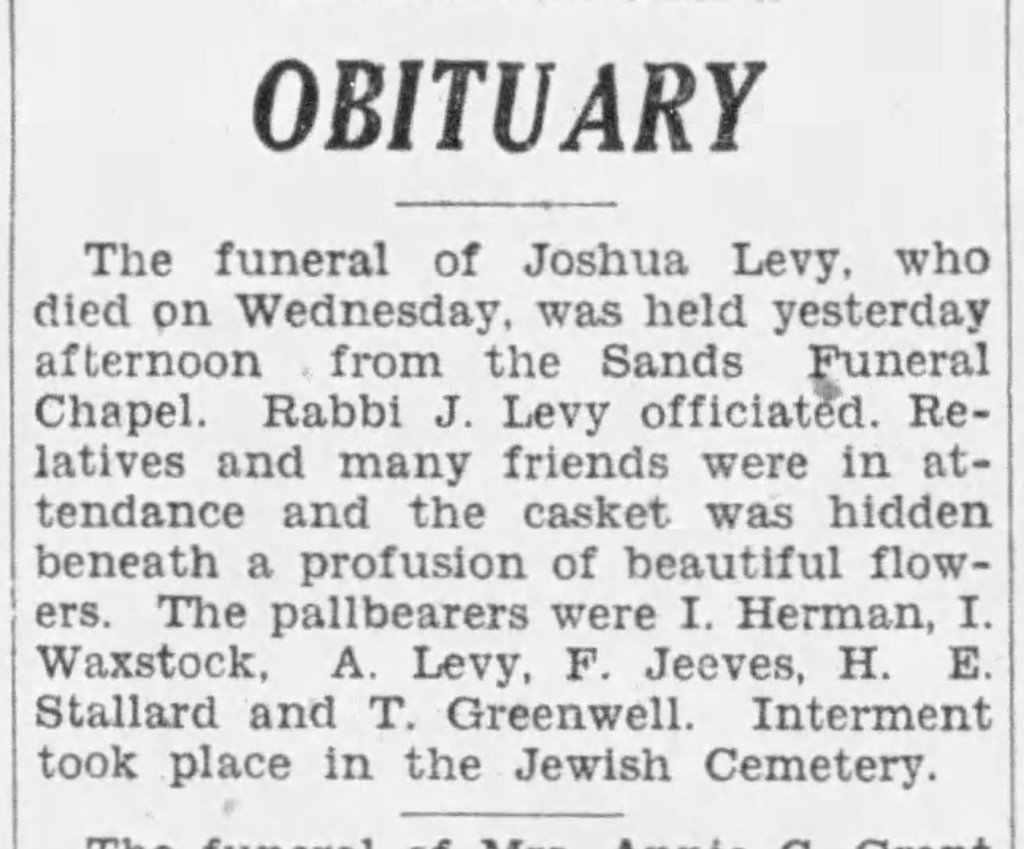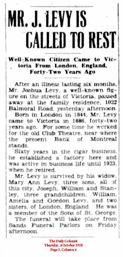 Joshua passed away at home. According the Times Colonist on October 6, 1928, burial took place at the Jewish Cemetery. “Relatives and many friends were in attendance and the casket was hidden beneath a profusion of beautiful flowers.”