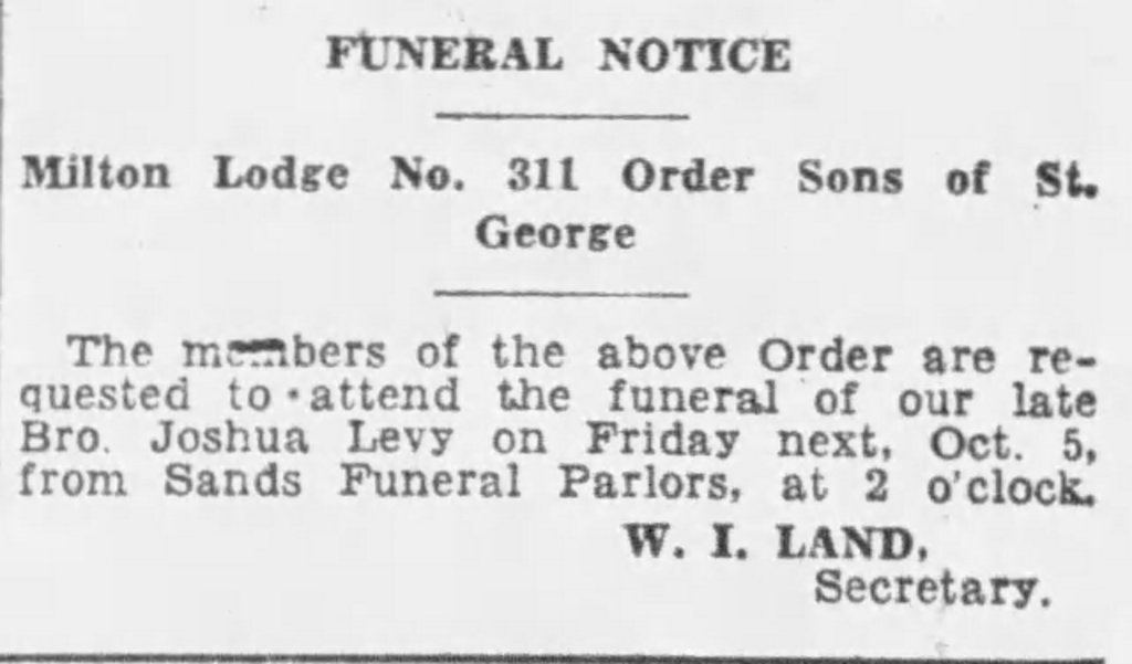 Joshua was a member of the Sons of St. George. That fraternal/benevolent organization was established by English immigrants to North America. The aim was to provide sick and funeral benefits to fellow Englishmen in North America.