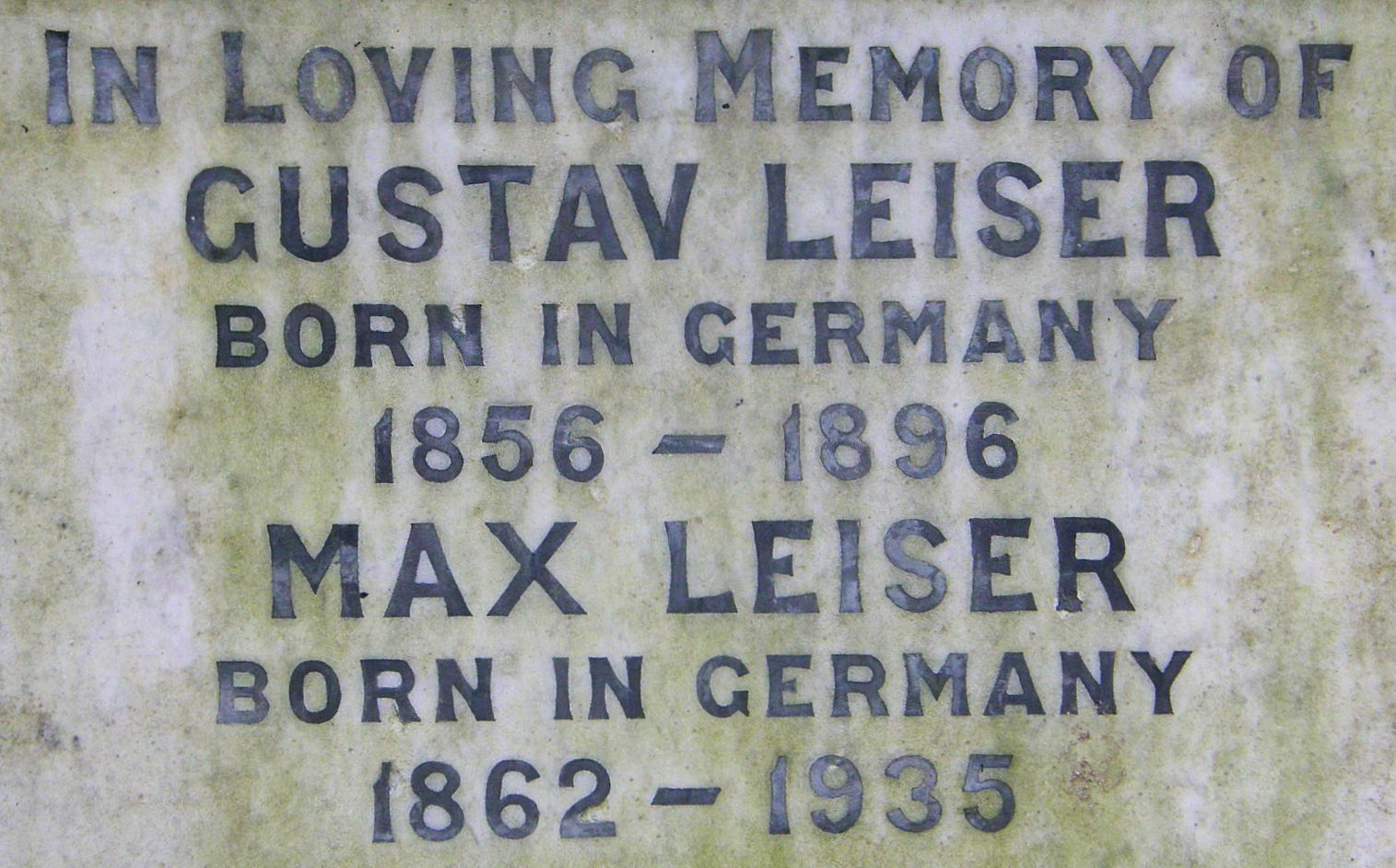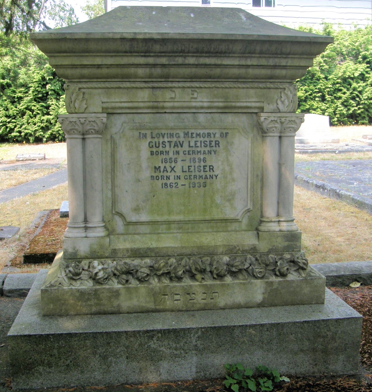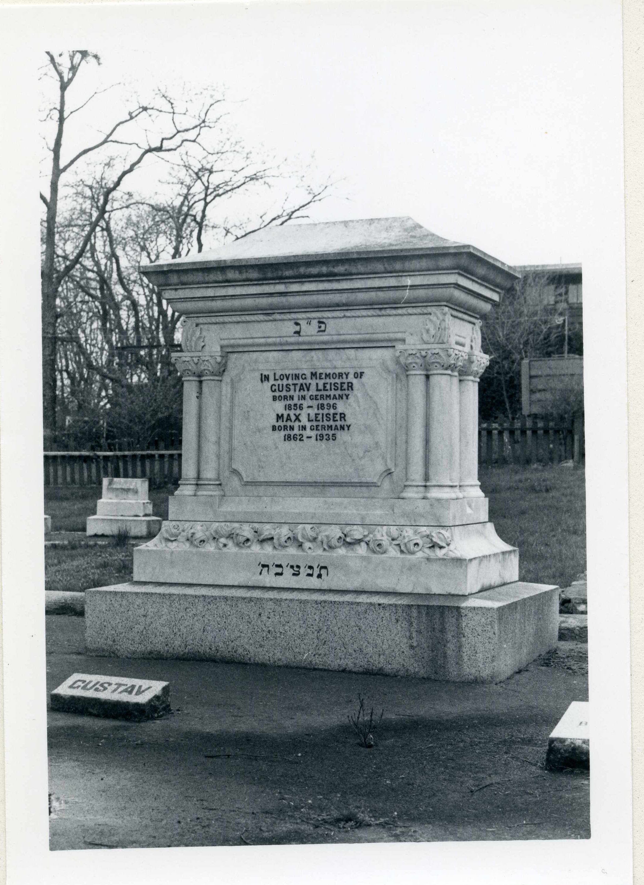 Max was a Freemason. He died on April 5, 1935 leaving a sizeable fortune, and properties including the Kaiserhof Hotel. He was buried in the same family plot, beside his brother Gustav. When Clare Leiser died, on May 1, 1958, she was interred beside Gustav. The Leiser headstone was one of the 5 desecrated in 2011.
