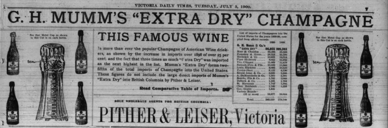 When Max came to Victoria, he became a salesman at his brother Simon’s grocery warehouse. He went on to purchase shares in the liquor business of Urquhart and Pither, founded in 1853. Max bought his partnership in 1893 and the name of the business was changed to Pither & Leiser. They were importers of Mumm champagne, Gordon’s gin and Johnnie Walker and Whyte & McKay whiskies.