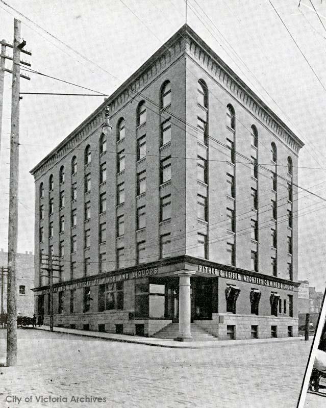The first Pither & Leiser warehouse was located at what is now 533 Yates, (corner of Yates and Commercial Alley). In was originally a 3 story building. Pither & Leiser’s second building at (535 Yates) was designed by architect Thomas Hooper in 1900. The final location for the Pither & Leiser Liquor Wholesalers was 1019 Wharf Street, (corner of Fort and Wharf Streets). Designed by the architectural firm of Thomas Hooper & C. Elwood Watkins, and built in 1906, the building is 6 stories and contains 72,000 sq. ft. It later became the Liquor Control Board.