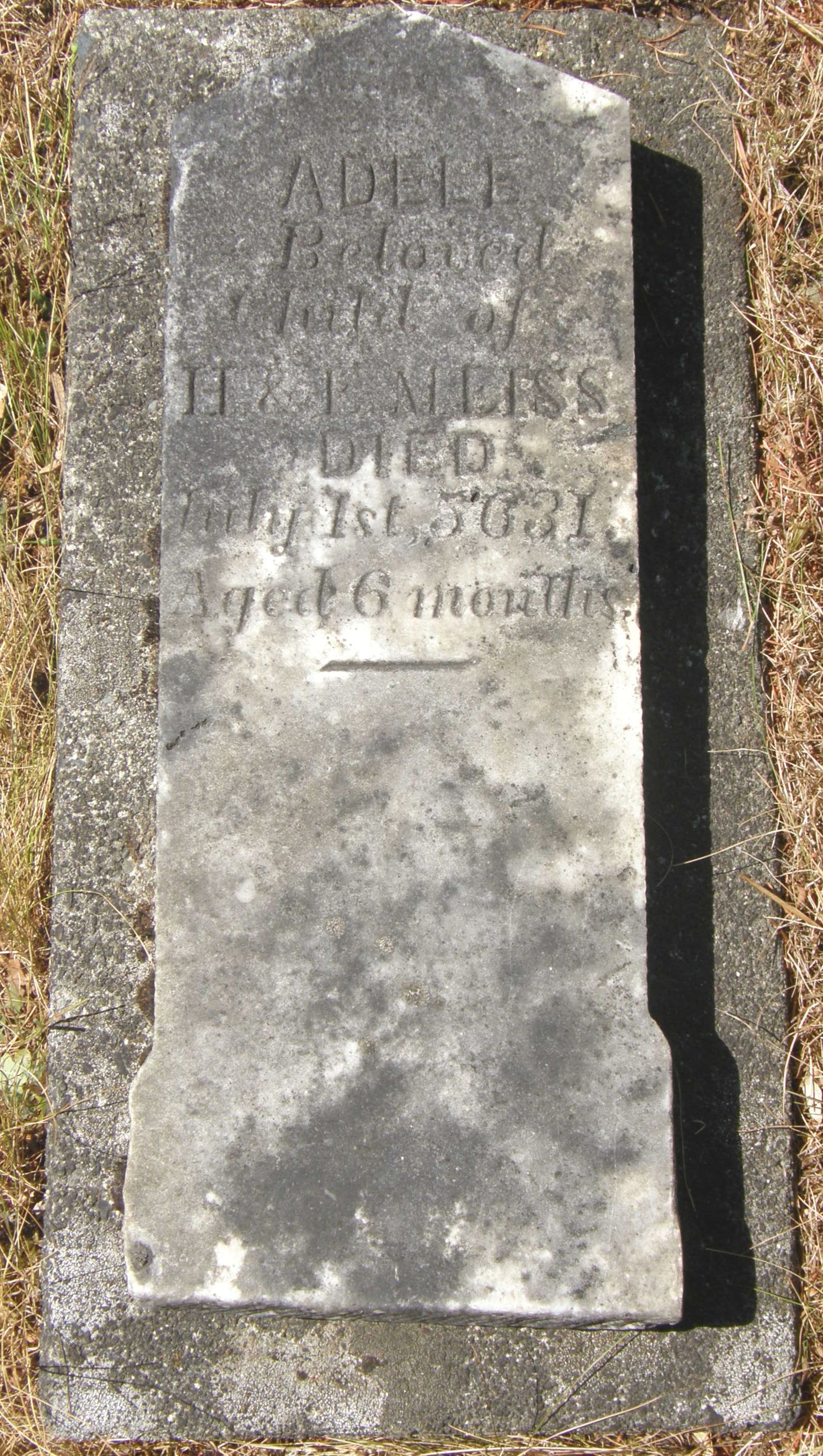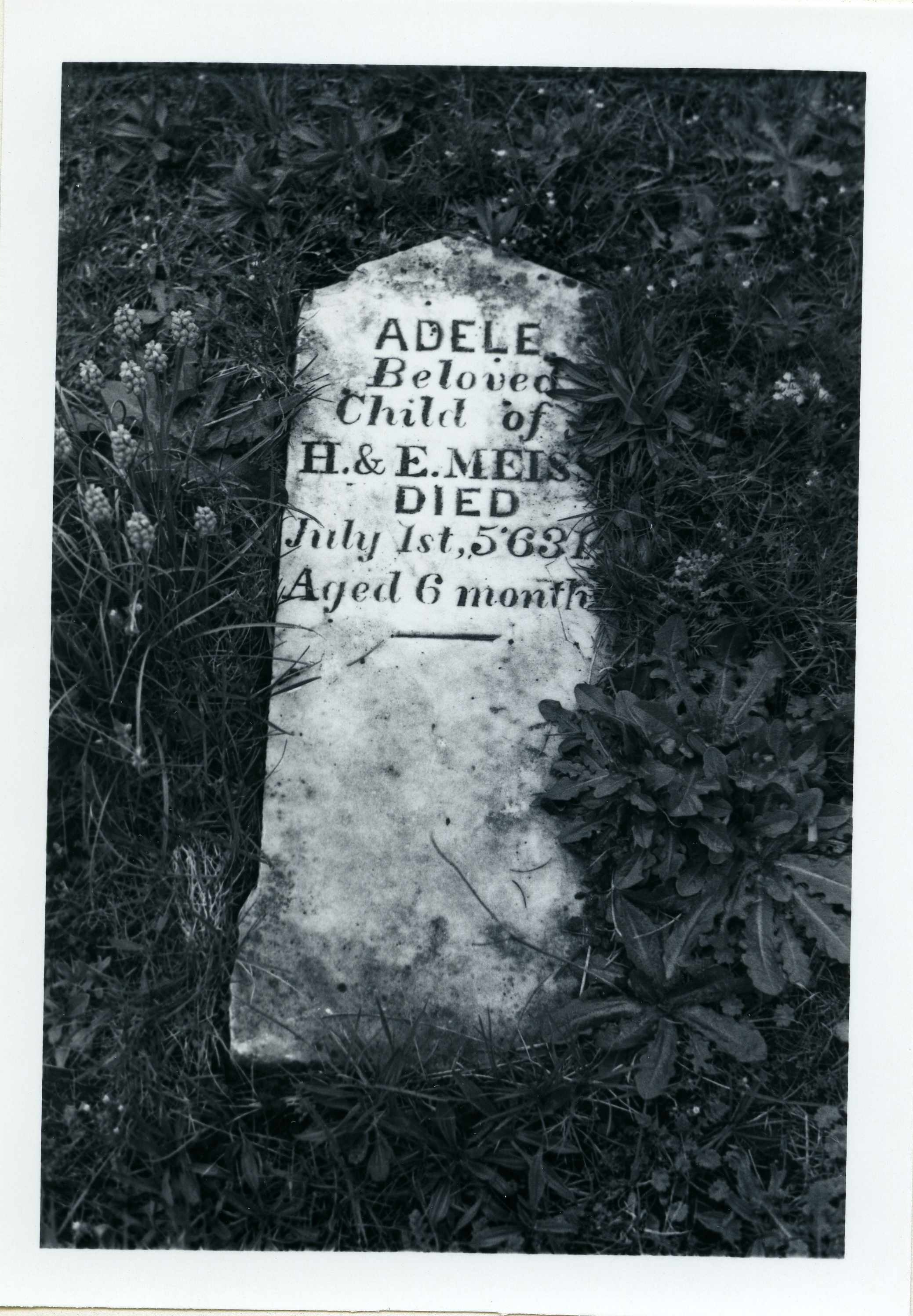 Adele Meiss was 6 months old when she died in 1871 (The memorial records the Jewish year, 5631) and placed next to her sister, Grace. Her grave is marked by a heavily weathered headstone laid horizontally on a cement marker.