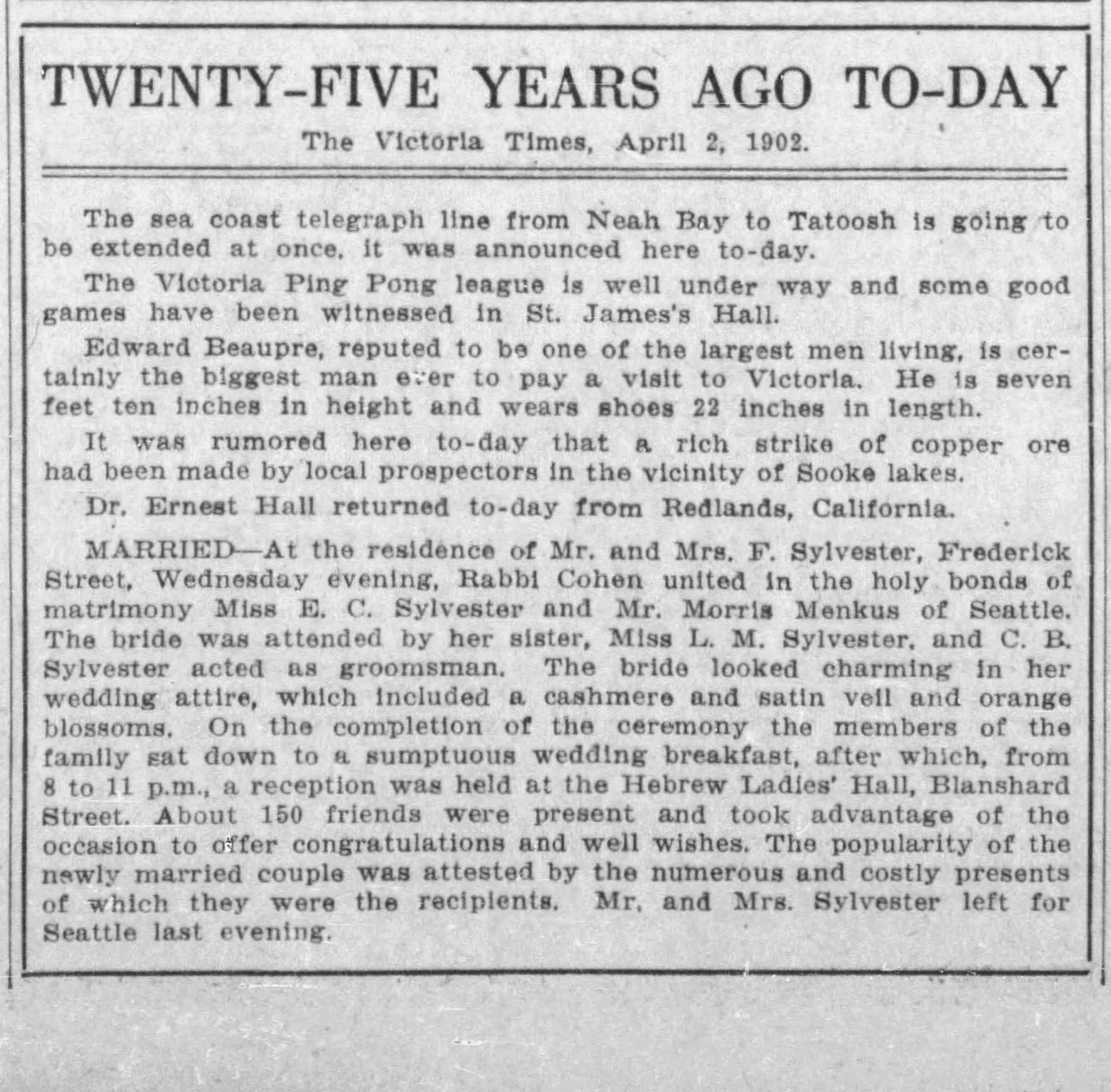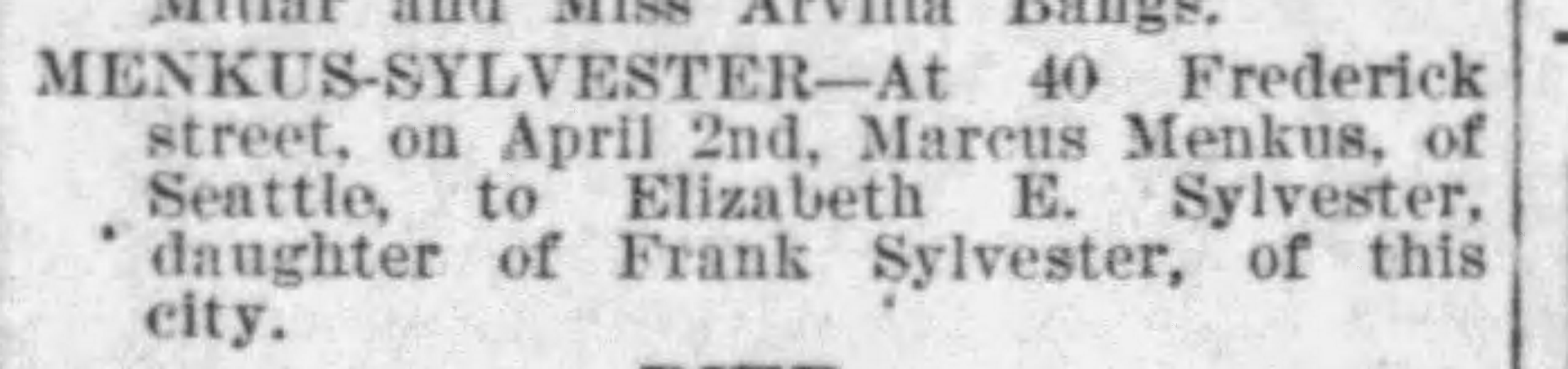 On April 4, 1902, Elizabeth Eula married Morris Menkus of Seattle. The marriage took place at the Sylvester’s home. Elizabeth had a cashmere and satin veil and orange blossoms. Louise Sylvester attended the bride and their brother Clarence “Toots” Sylvester attended the groom. Rabbi Cohen presided after which the parties had a sumptuous wedding breakfast. A reception as held at the Hebrew Ladies Hall. One hundred fifty people attended. The paper reported that the couple received “numerous and costly gifts.” The newlyweds set out for Seattle in the evening.