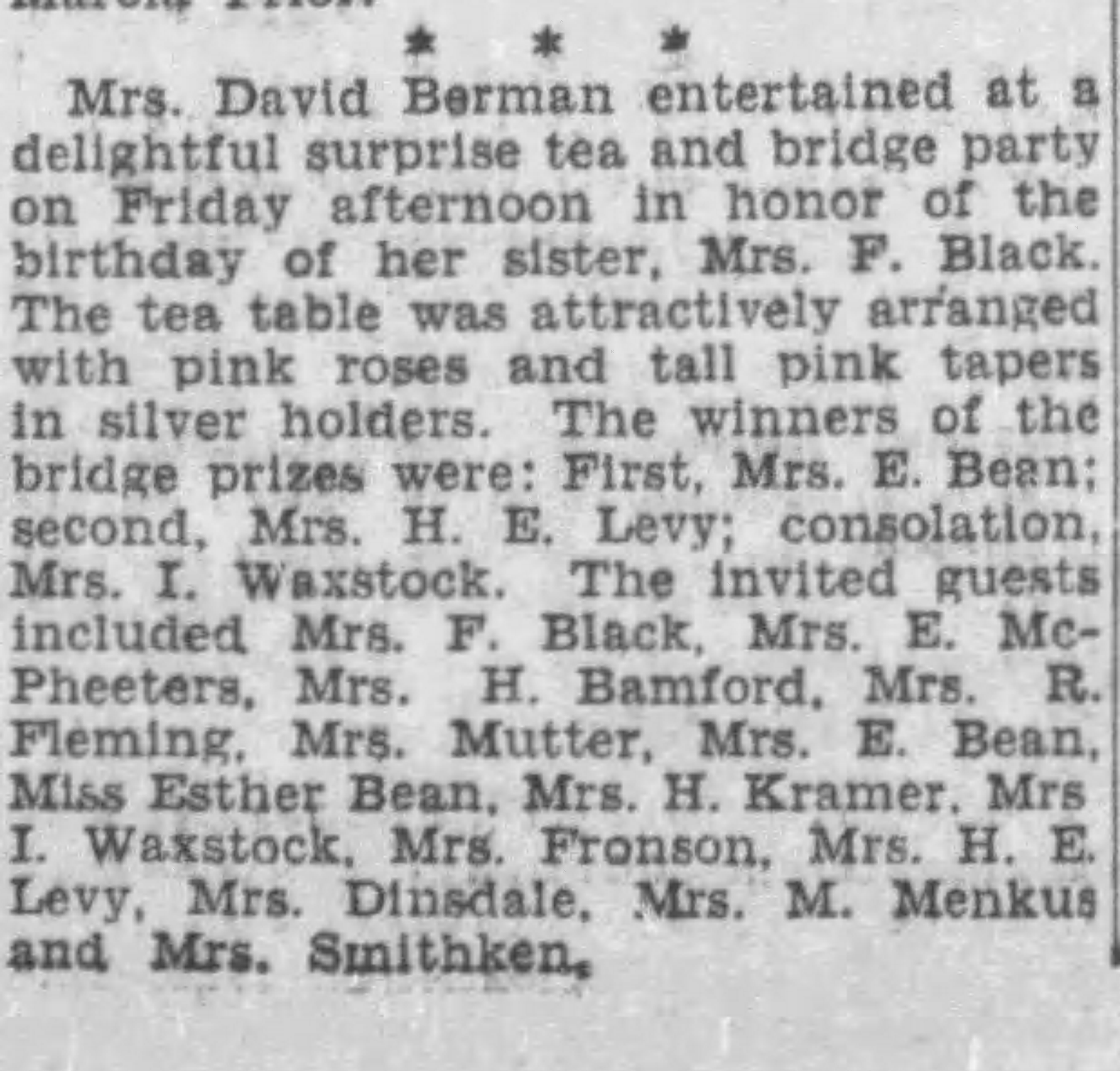 Elizabeth travelled in society circles. The Victoria Daily Times reported on August 2, 1930 that Elizabeth attended a “delightful” surprise tea and bridge party hosted by Mrs. Berman. However, Elizabeth didn’t win any of the bridge games.