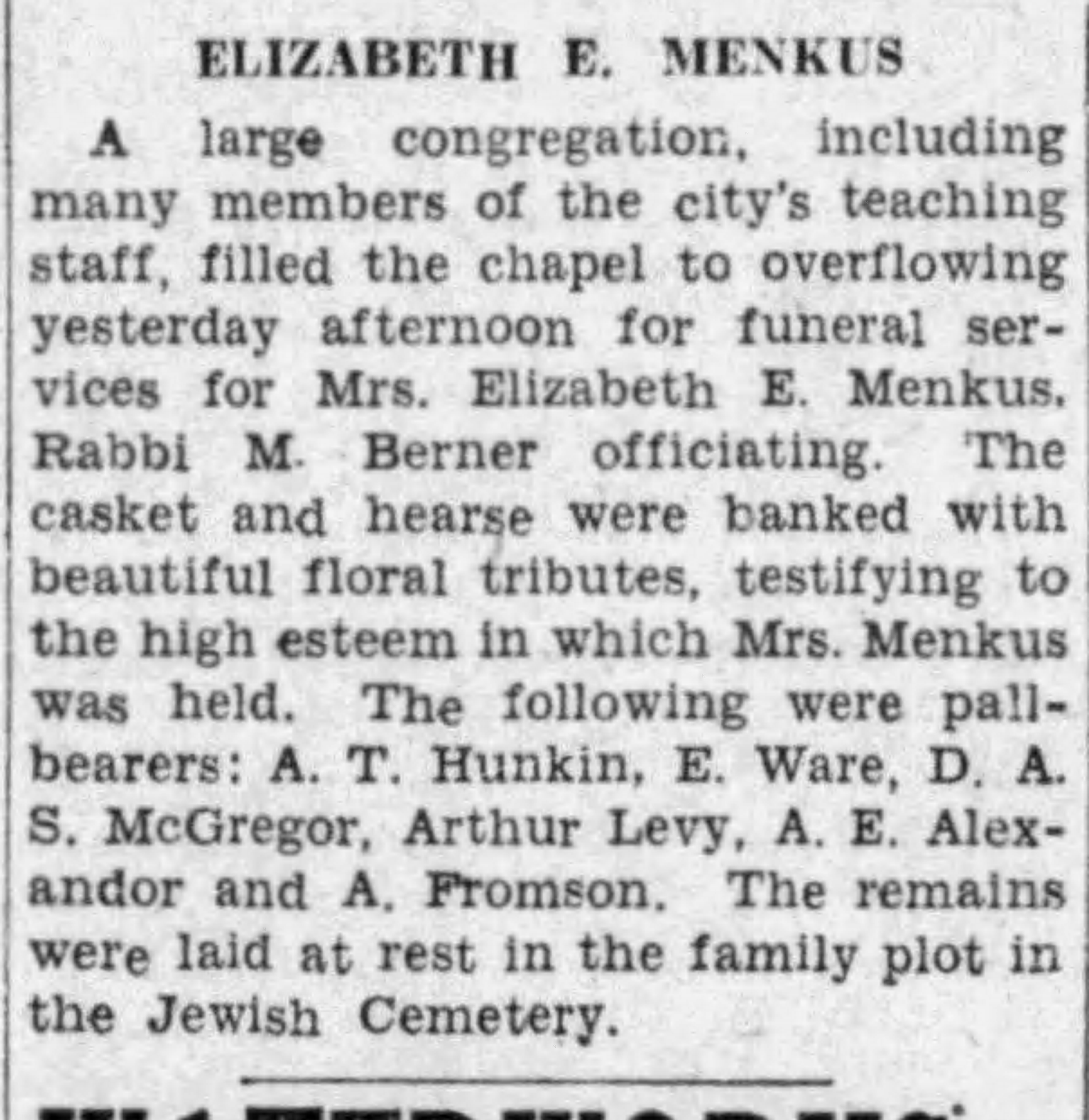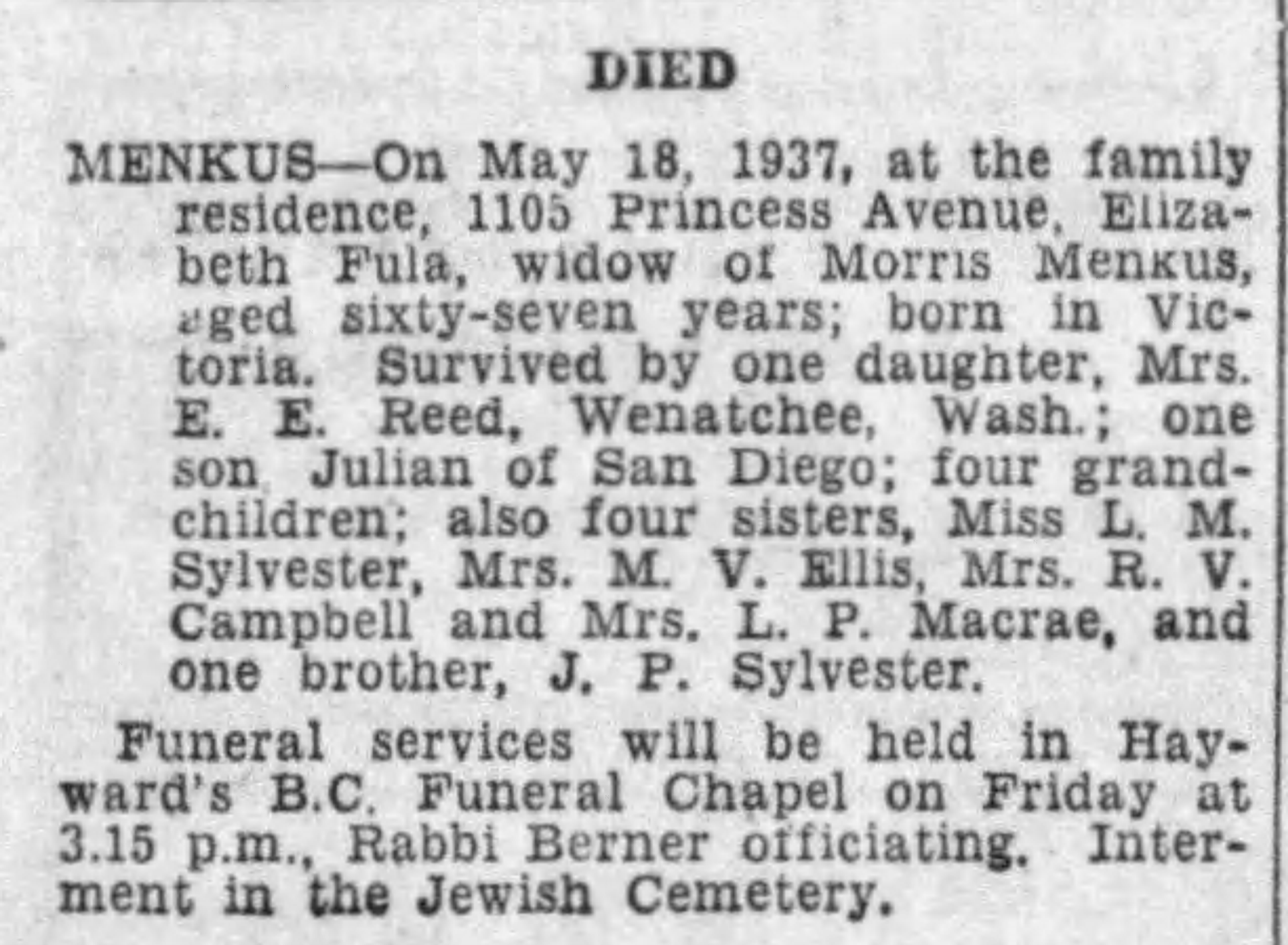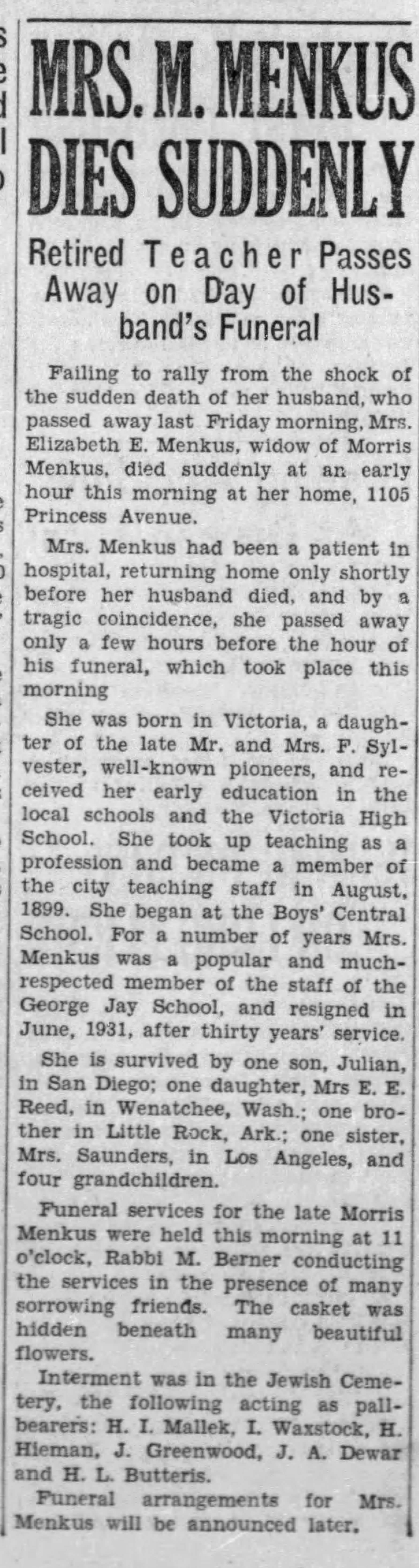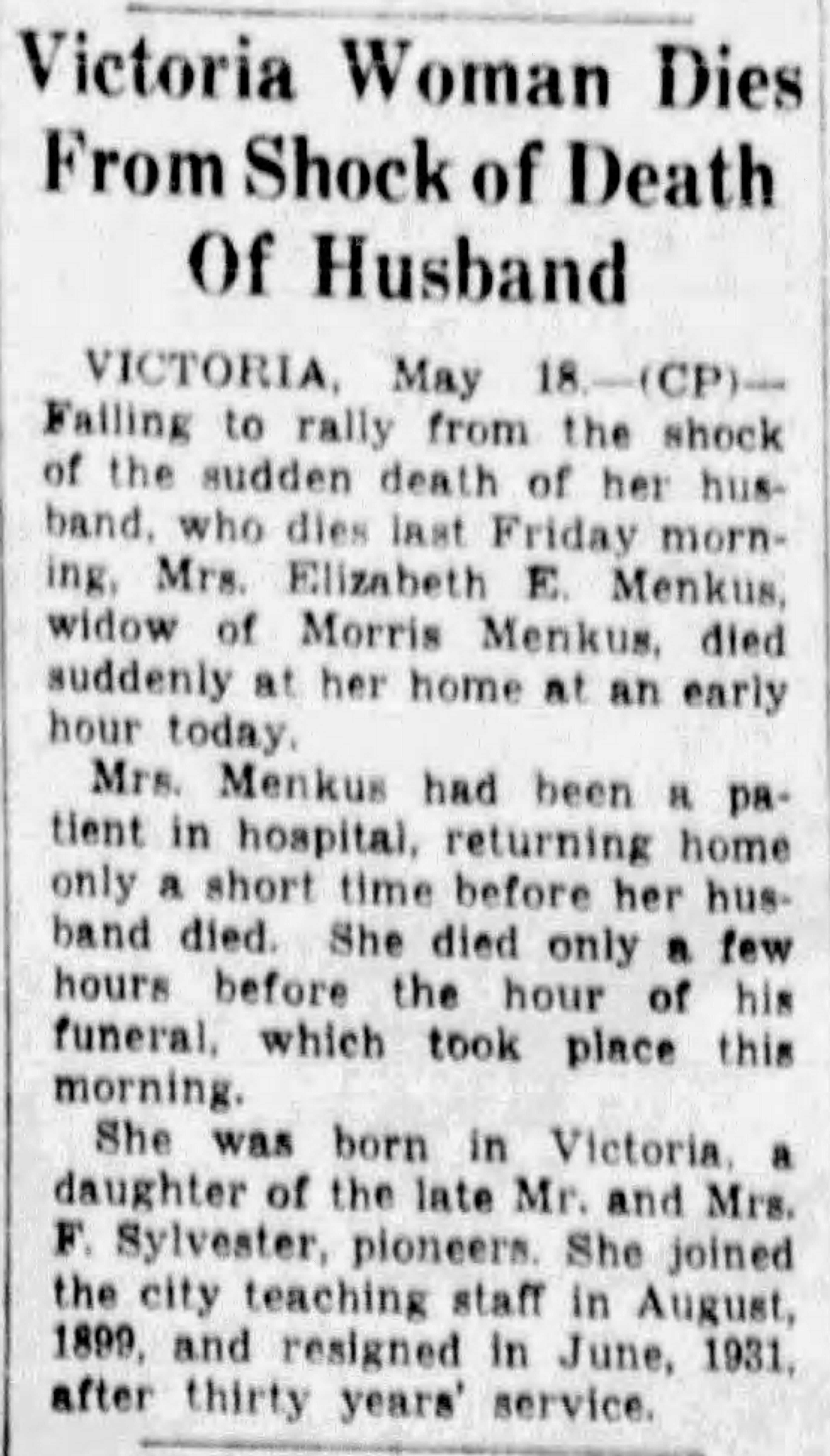 The Times Colonist on May 18, 1937 reported that Elizabeth returned home after having been in the hospital. Shortly after, Morris died suddenly. Elizabeth died unexpectedly hours before Morris’ funeral.