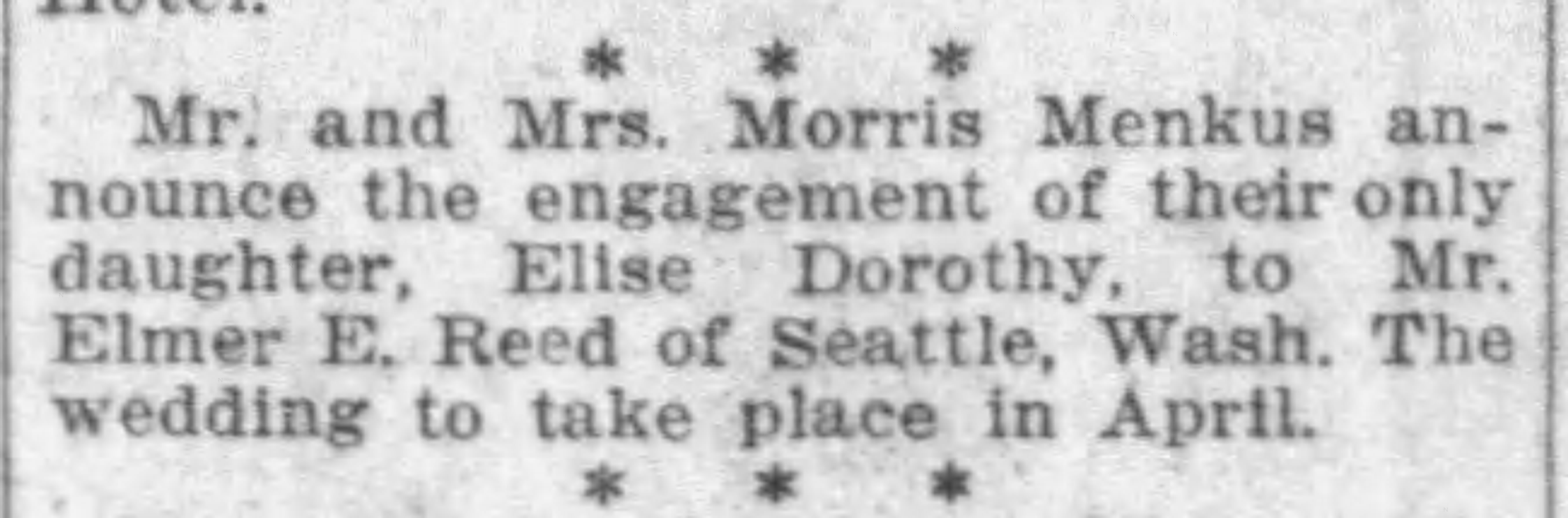 Elise became a stenographer. On April 19, 1924 she married Mr. Elmer Edwin Reed of Seattle in a Civil Service at the Court House in Victoria A sumptuous lunch at the Menkus family home at 1105 Princess Street followed. The Times Colonist reported that “The pretty girl bride was unusually charming in a dress of delphinium blue courgette, a hat made of blue visca with grey accessories. Her coat was black trimmed with monkey fur. The presents were numerous and beautiful and included a number of substantial checks. The couple left for Vancouver en route to their honeymoon in Portland.” The couple planned to live in the Westport Apartments, Queen Anne Hill, Seattle. By 1935 Elise and Elmer were living in Beverley Hills with their two children Dorothy and Richard.