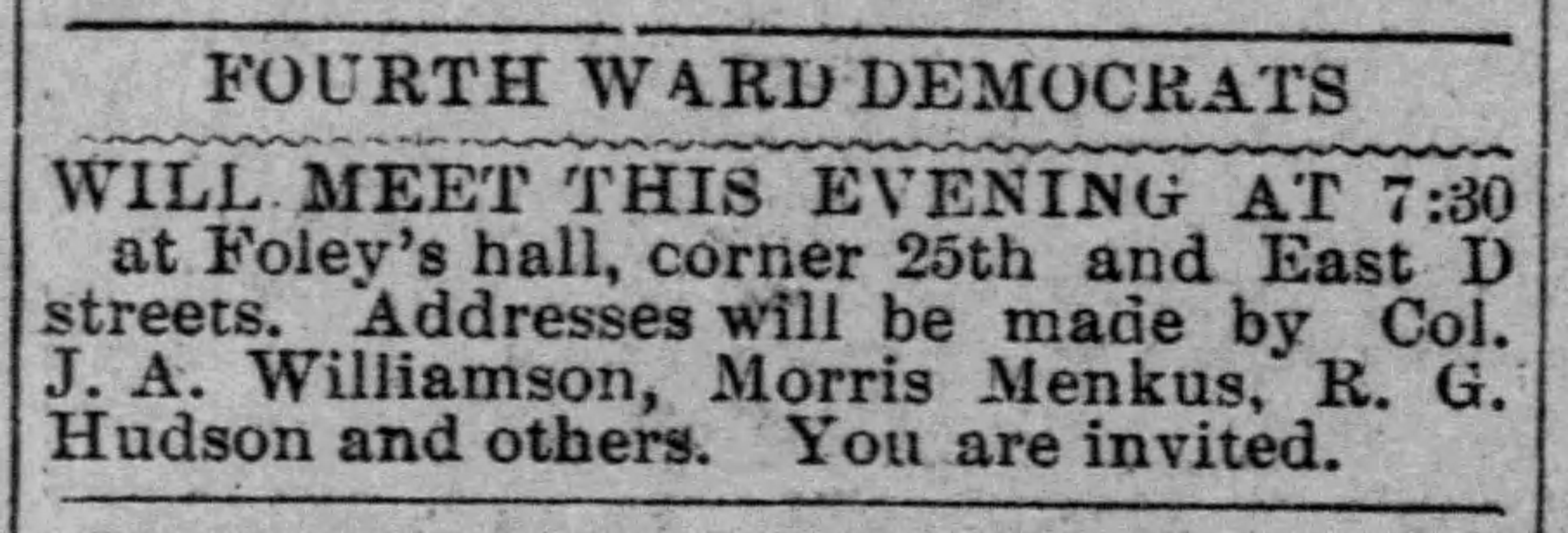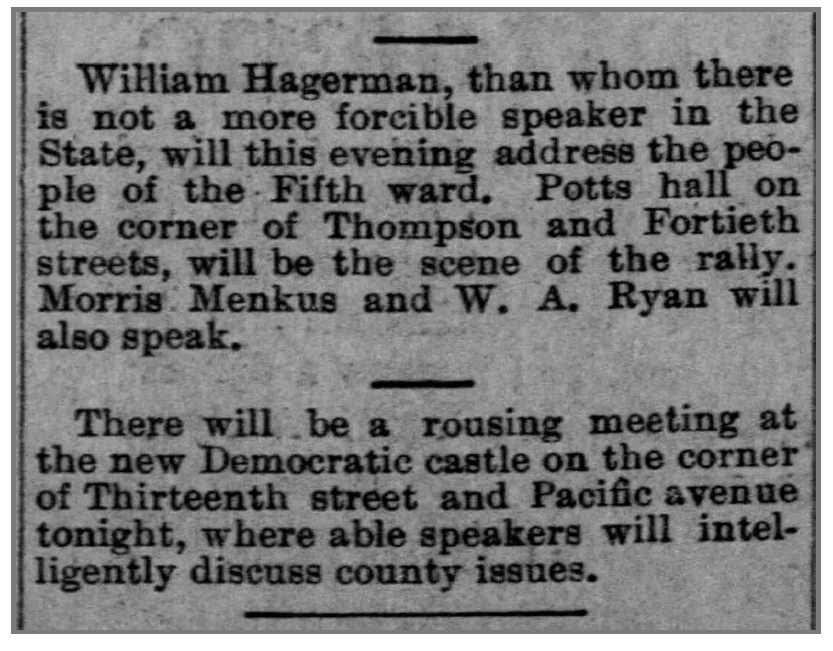 Morris spoke at a number of Democratic rallies. On October 26, 1894, The Tacoma Daily News noted that Morris would be a speaker at an upcoming Democratic rally and that “speakers will intelligently discuss county issues.” On October 28, 1894 that paper reported that there had been a contentious nomination convention held by the Democratic county convention, and that Morris had been elected secretary. The Tacoma Daily Ledger reported on August 23, 1898 that Morris had been elected a delegate at a poorly attended meeting of the Second Ward, third precinct.