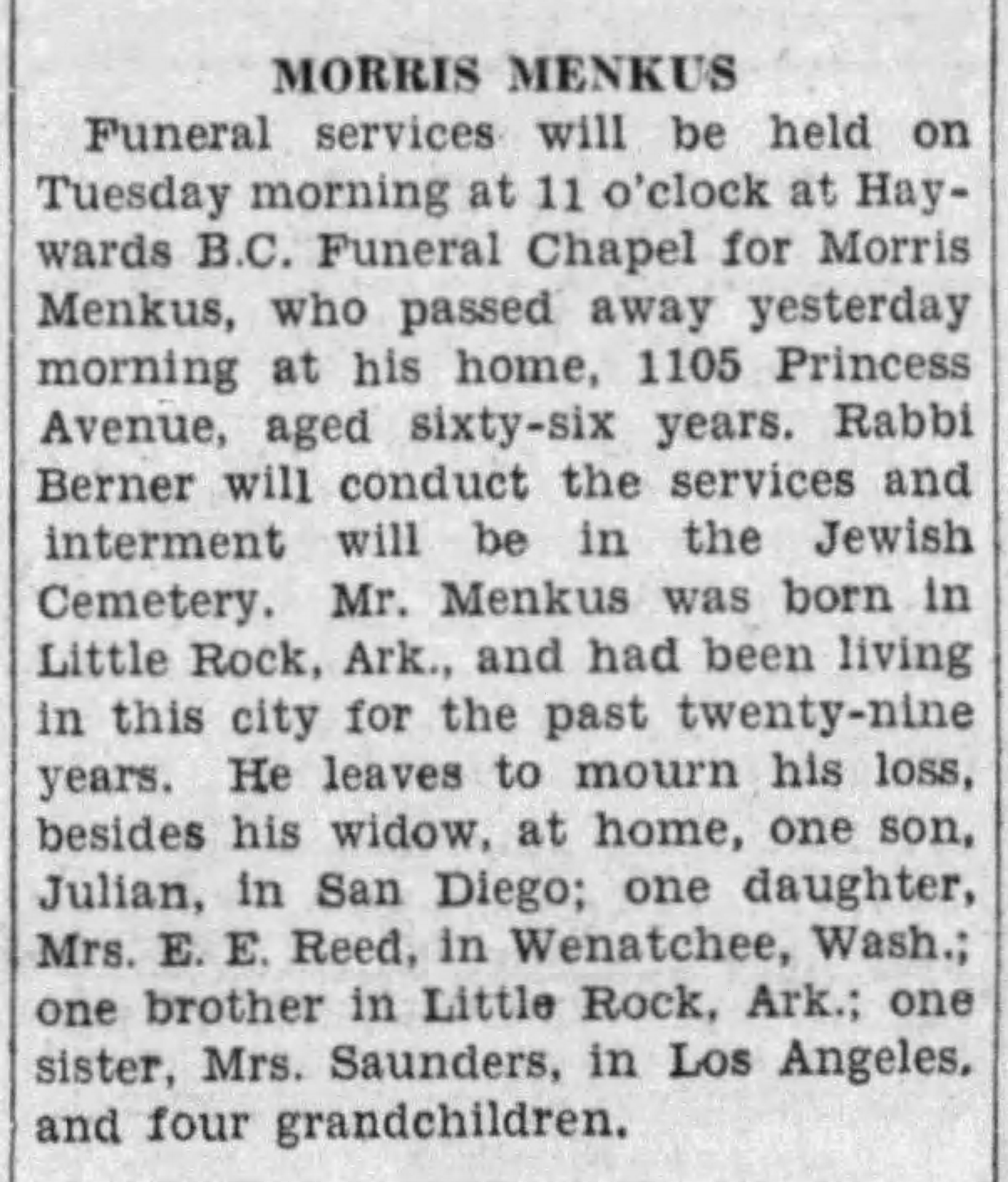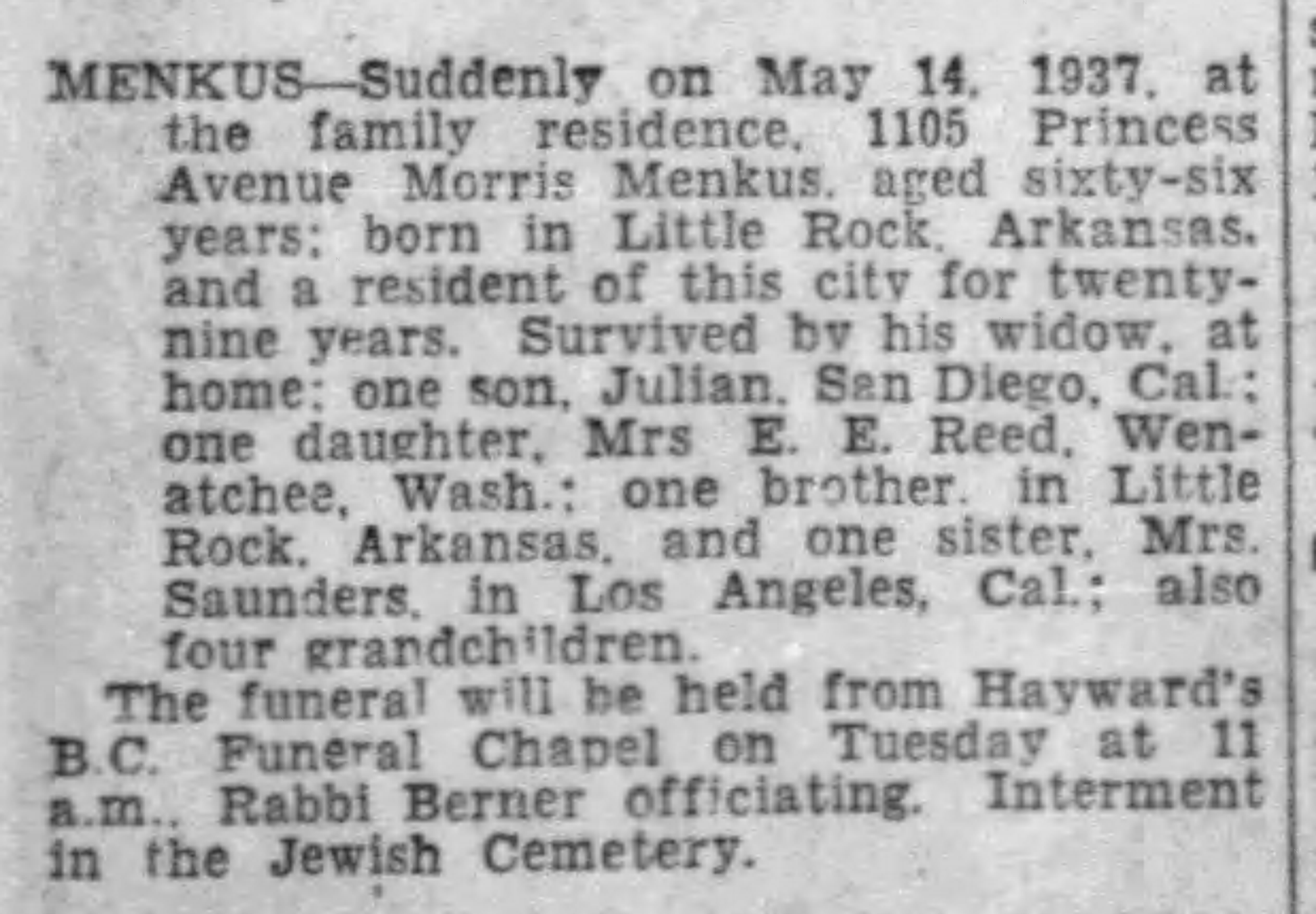 The couple’s daughter Elise Dorothy was born in Victoria on March 5, 1903. The couple moved to Seattle, where on July 4, 1904 their son Julian Alfred was born. While the family lived in Seattle, Morris sold life insurance. The Menkus’ returned to Victoria in 1908.
