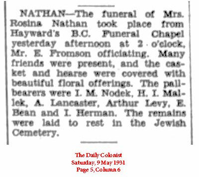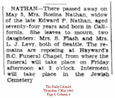 Rosina met and married Liverpool born Edward Philip Nathan while in San Francisco. They married on May 13, 1885. Sometime after, Lewis Lewis persuaded the couple to move to Victoria by offering Edward a position as his bookkeeper. By this time, Lewis and his son Aaron were running the stove and tinware business; Lewis Lewis & Co.