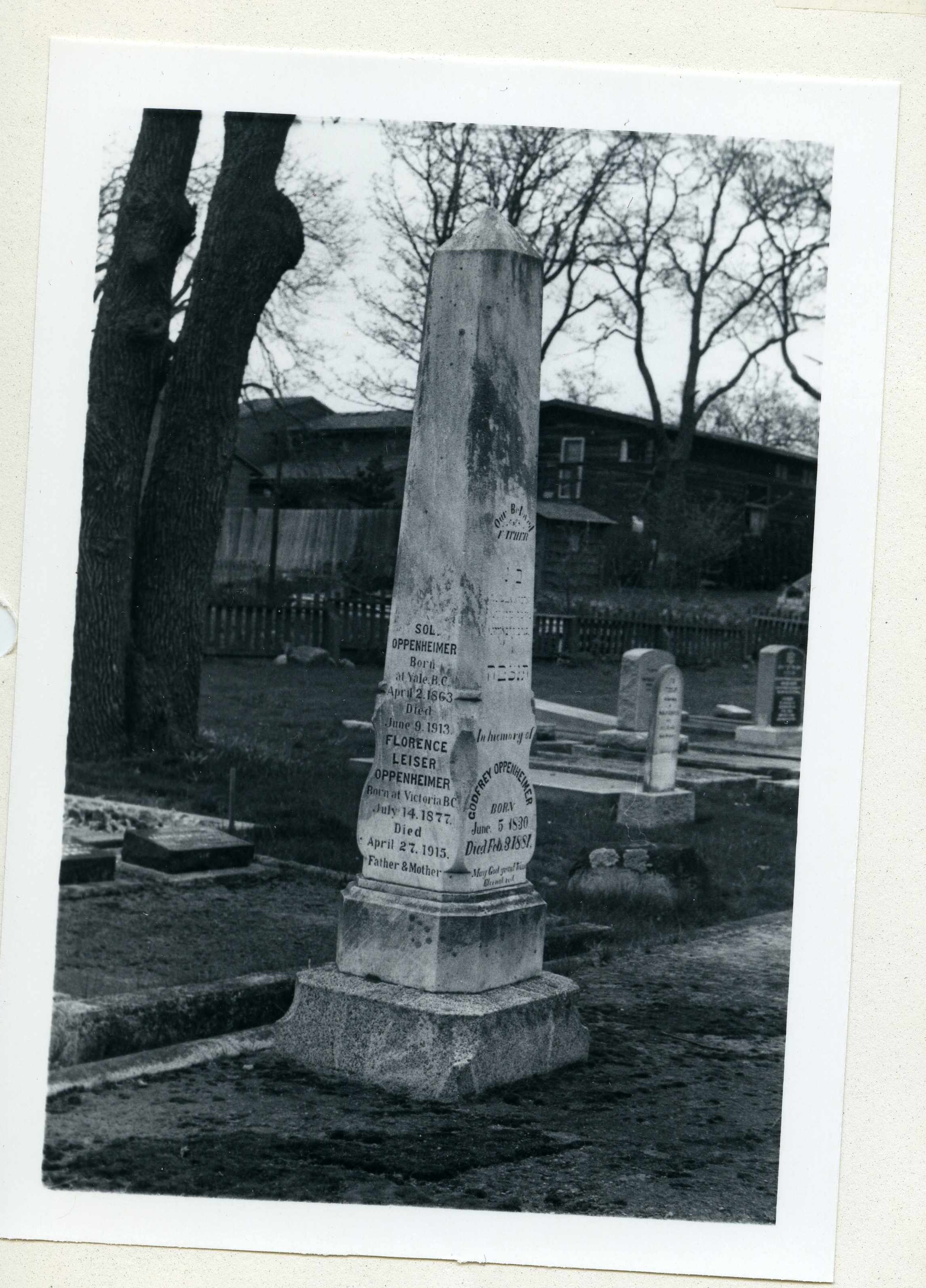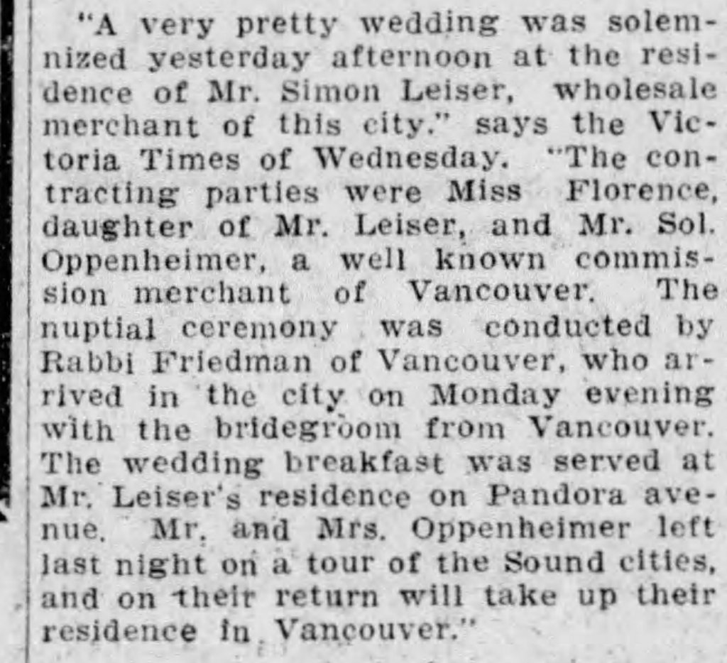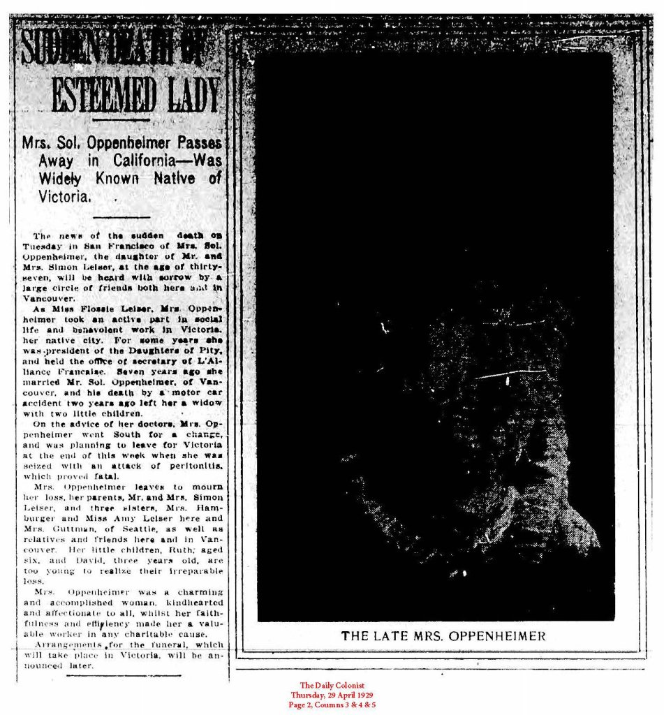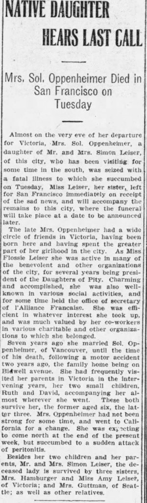 She married Sol Oppenheimer married on February 25, 1908. He died in a car accident two years prior which left her with two small children to raise. The pallbearers were: O Pearson, F Lansberg, C F Gardner, H Macklin, Roy McIntosh, A E Hinem.