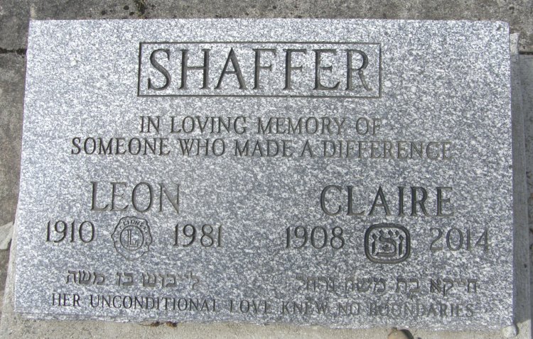 Biography: SHAFFER, Claire Passed away on May 11th, 2014 at 106 years of age. She was born on April 13th, 1908 in Fort Qu’appelle, Saskatchewan, and went to college in North Battleford, Saskatchewan where she met her husband, moving then to Loreburn where she started her family and after that to Moosejaw and finally to Victoria where she lived for the last fifty-four years. Claire is predeceased by her husband, Leon and daughter Darlyn, and survived by her son Cyril and grandchildren Eileen, Dean, Drew, Myles and nephew Noel. A graveside service was held at the Jewish cemetery in Victoria on Monday, May 12th, 2014. Claire will be remembered for her incredible optimism and strength of spirit and, most of all, for her ability to love and accept everyone equally. Her generosity and good sound advice will leave a profound effect on all who knew her. We will miss her deeply.