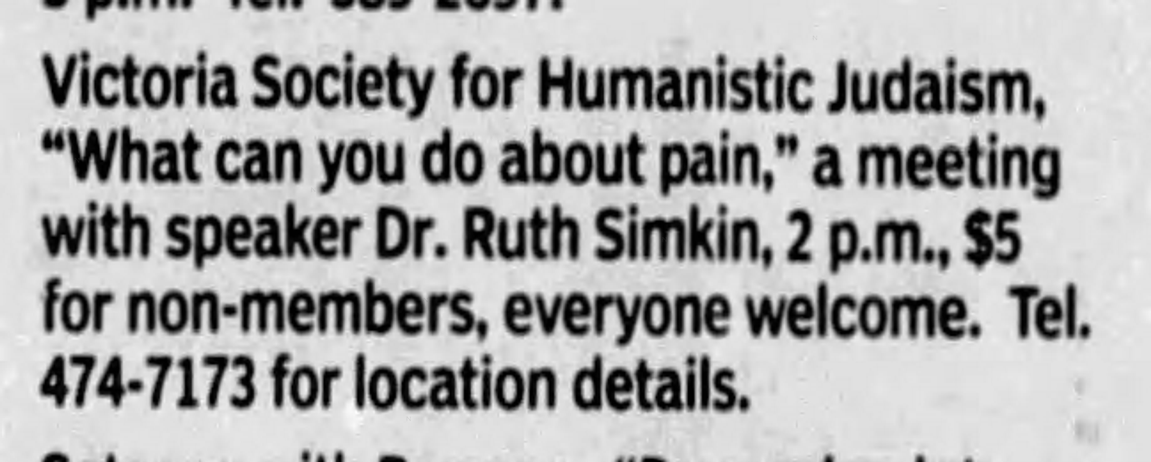 Ruth Simkin (of Winnipeg, Manitoba) passed away in her current home in Victoria, BC. Ruth’s long-standing career as a physician began in family practice in Calgary, Alberta. Later in life, she became the first physician in BC to receive her fellowship in palliative care. Although healing and comfort were extraordinary talents of hers, she led a diverse and creative life of travel, women’s activism and animal rights. She was a life long learner and curious about many things. As a second career Ruth became a prolific author and published 7 books. Ruth was a lover of life and lived hers to the fullest. Ruth is survived by countless family and friends and will be dearly missed. Donations in her memory, can be made to BC SPCA or Canadian Women’s Foundation.