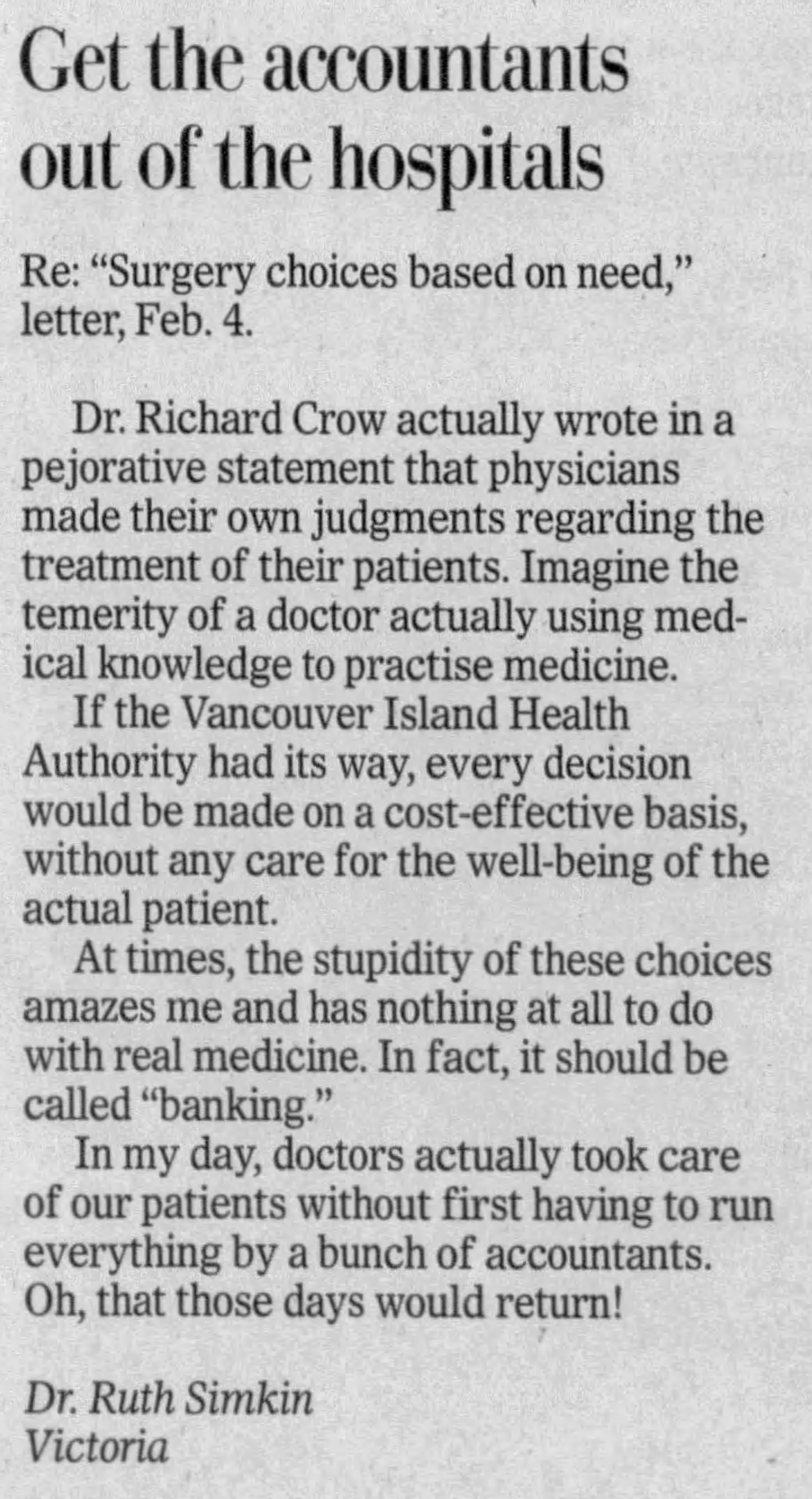 In the early 1990’s Ruth moved to Salt Spring Island where she became a farmer of yuppie veggies for almost ten years. She then returned to medicine, becoming the first fellow to study palliative care at The University of British Columbia Medical School. She did a fellowship for almost three years, and subsequently became board certified by the American Board of Hospice and Palliative Medicine, becoming a specialist in pain and symptom management of dying people. For five years, she worked at the Victoria Hospice during which time she left Salt Spring Island and moved to Victoria. In 2014, she was honoured with a Life Membership conferred by the College of Family Physicians of Canada