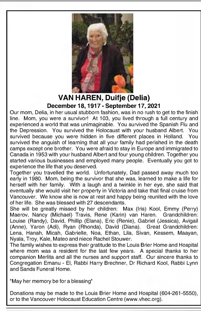 Delia Van Haren, nee Van Dam, or just Baba to us kids (and Baba D to the great-grandchildren). I have such fond memories of my times with her, visiting her, being in her presence. How excited we would get when we visited her and Zaida at their condo in Victoria. Apart from the ferry ride, which we loved, it was always so much fun to be there. I remember the little candy bowl she would keep in her kitchen. She would let us take as many of the little candies as we wanted. I always loved the little coffee ones that had the special wrapper on them. And of course she would always have double salted licorice. There was no such thing as too much sugar in her world. For breakfast, we would have white bread that we would liberally cover with chocolate hail. There were also stroop waffles. For a little kid, this was heaven. The real treat though was when she would make a stack of roll up pancakes. We would douse ours with maple syrup before rolling them up. I remember that Baba had her own method, which even as a kid I thought might be a bit extreme. She would cover her pancakes with white sugar. Who knew that eating a lot of sugar was the key to a long life? Baba always had a smile and a joyful laugh. She took pleasure in us, her grandchildren, something that I felt even as a young child. She would call us “schott” or “shatzi” with a smile and a twinkle. Sometimes she would entertain us grandchildren with little tricks, like showing us her dentures. We would stand around in a little circle as she would demonstrate how she could take out her teeth. Or remember her favourite little prank? She would hold up a dessert to one of us and say, “Smell this”. When you bent down to smell it, she would raise it just enough so that your nose would sink into it. She thought this was the most hysterical thing and would laugh and laugh. Baba loved little kids and this was even evident in the pictures she had on her walls, many of them of little boys innocently peeing outdoors somewhere. As I think about my childhood experiences with Baba, I realize that she was able to cultivate a kind of joyful refuge in her home, a fun place for us kids.