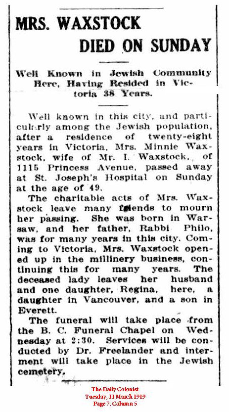 According to the Victoria Daily Times on October 12, 1908, Ethel and Regina, performed when the Victoria hive of the Ladies of the Maccabees celebrated the 16th anniversary of their order. Ethel played a piano solo and Regina sang. The Victoria Daily Times reported on April 18, 1910 that Misses Waxstock had performed at a concert for St. Andrew’s Society.