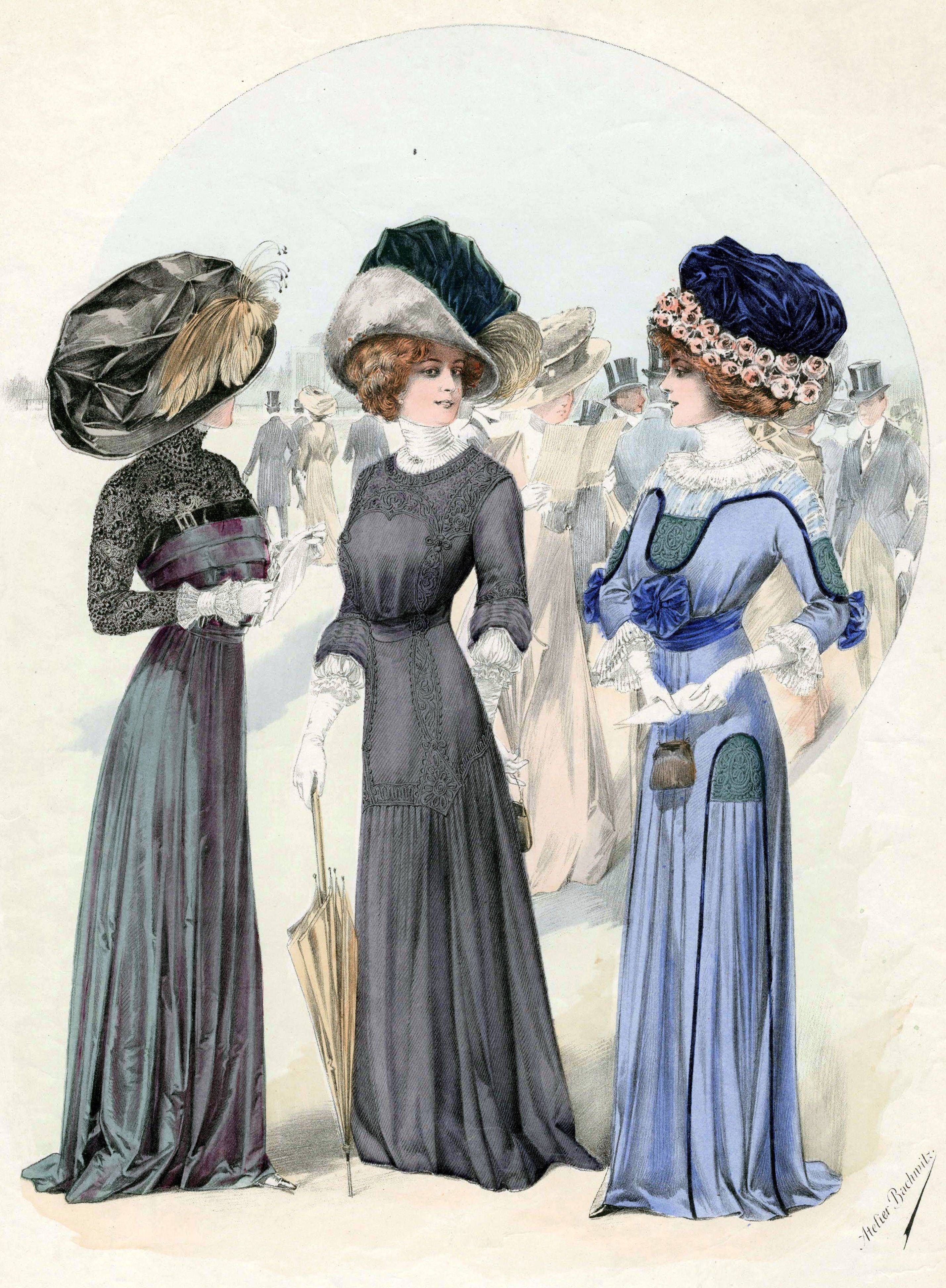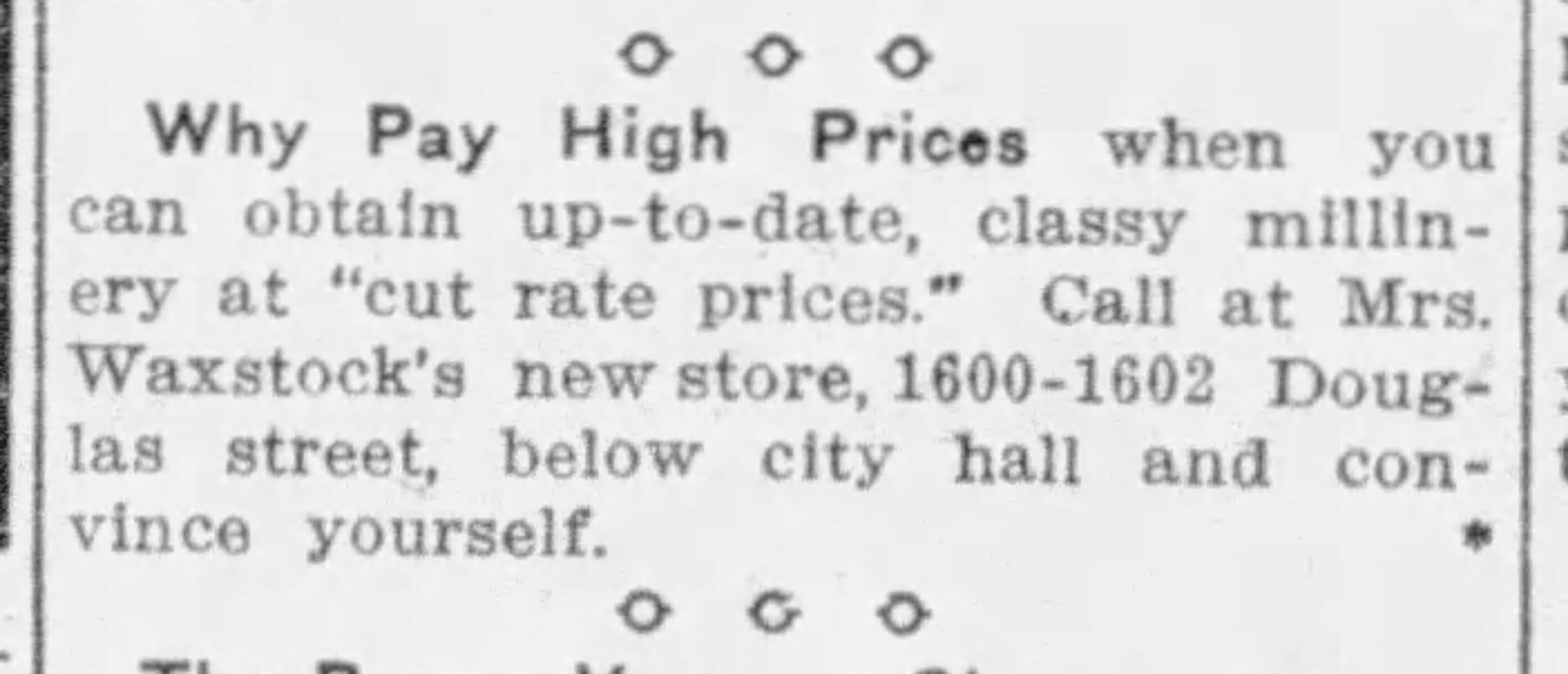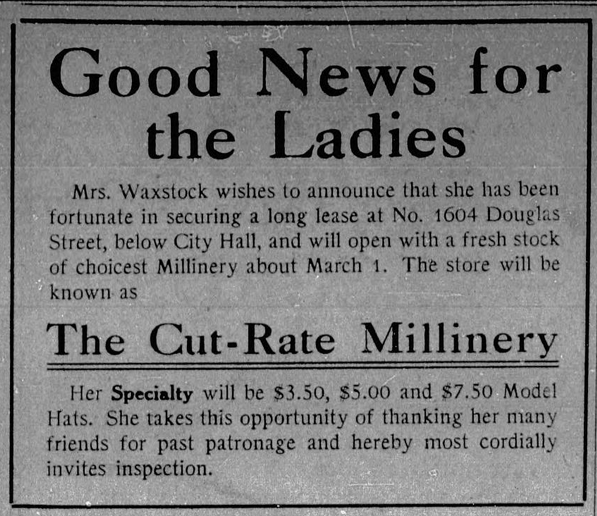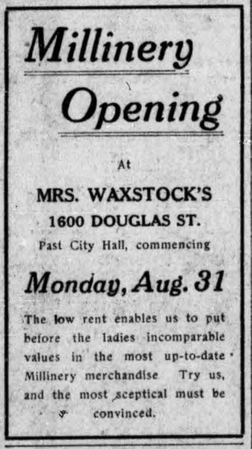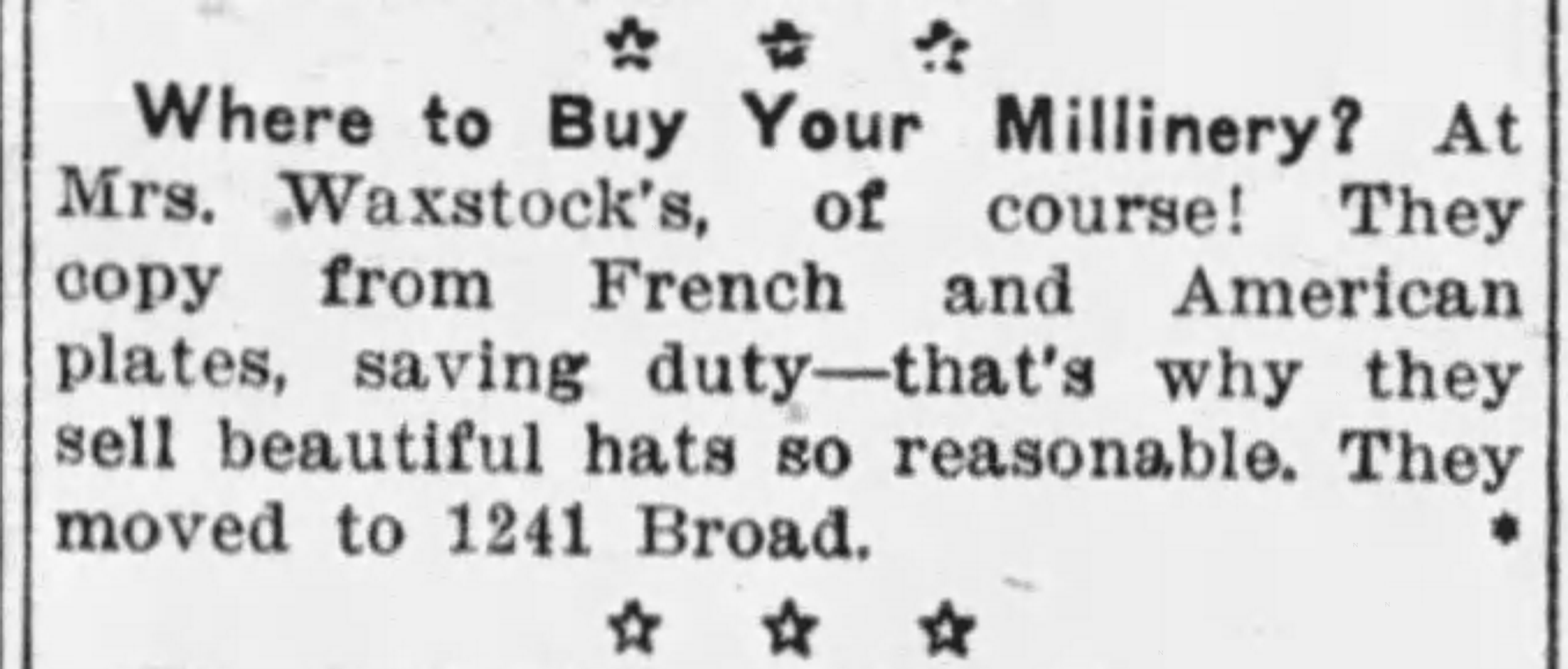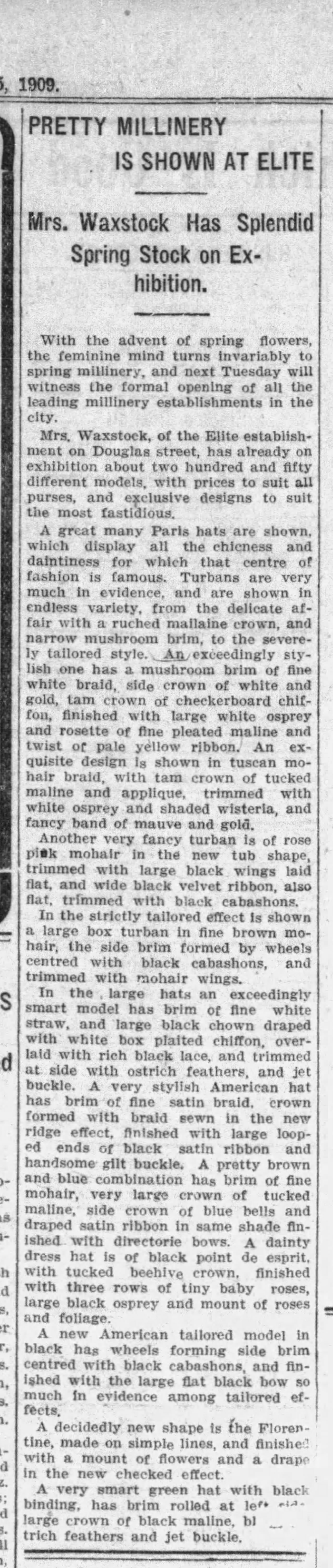 The article continues: “On the whole, the hats shown in this store are more artistic and more becoming than last year, and that is saying a lot. Many of the styles imitate very closely those worn in France in the time of Louis XIII., Louis XIV., and Napoleon. In the matter of trimmings, flowers still prevail with the smaller flowers in most favor…. Grasses in all colors, the natural cured grasses, are seen almost everywhere. Natural wheat and other grains are used with great effect at this (Mrs. Waxstock’s) shop, the natural ingenuity and artistic sense of Mrs. Waxman and her large staff of young ladies turning out some of the most delightful effects.” See the above article for more details.