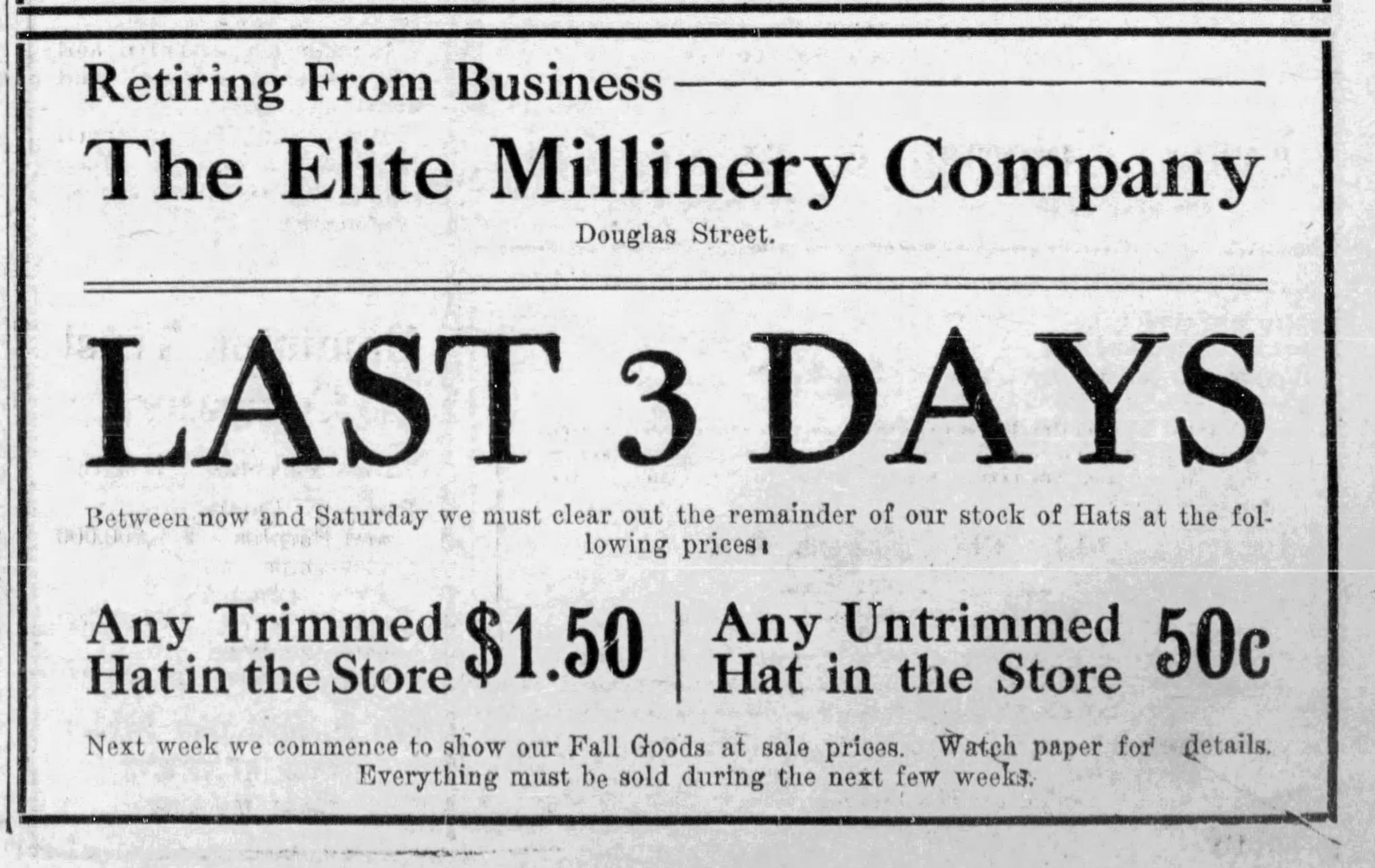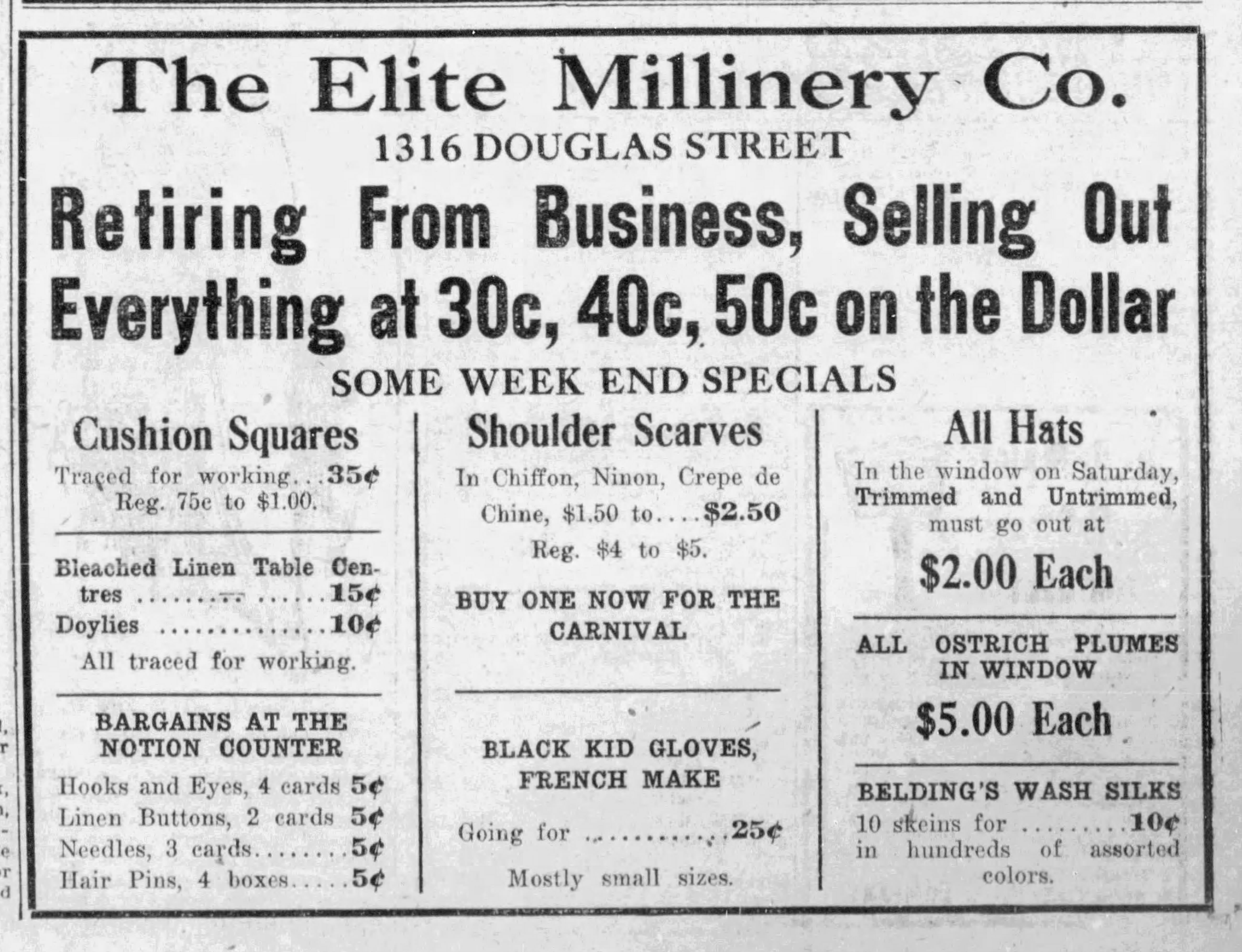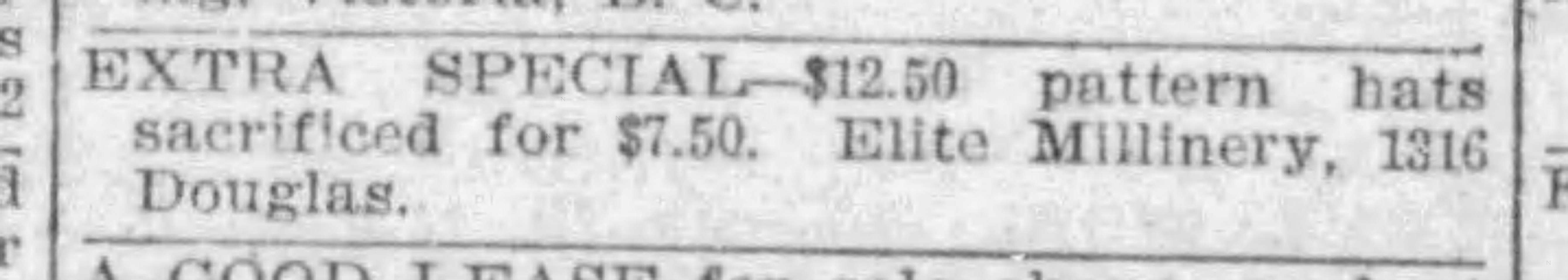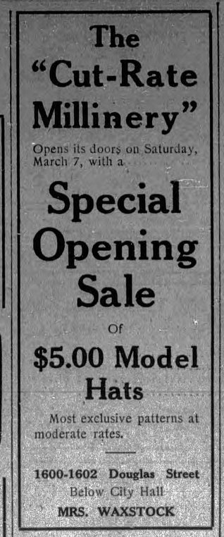 According of The Daily Colonist on February 26, 1914, Millie secured a long-term lease at 1604 Douglas Street. She would be opening a new store with a “fresh stock of choicest millinery in early March. The store would be known as The Cut-Rate Millinery.” There was also a store in Vancouver by the same name.