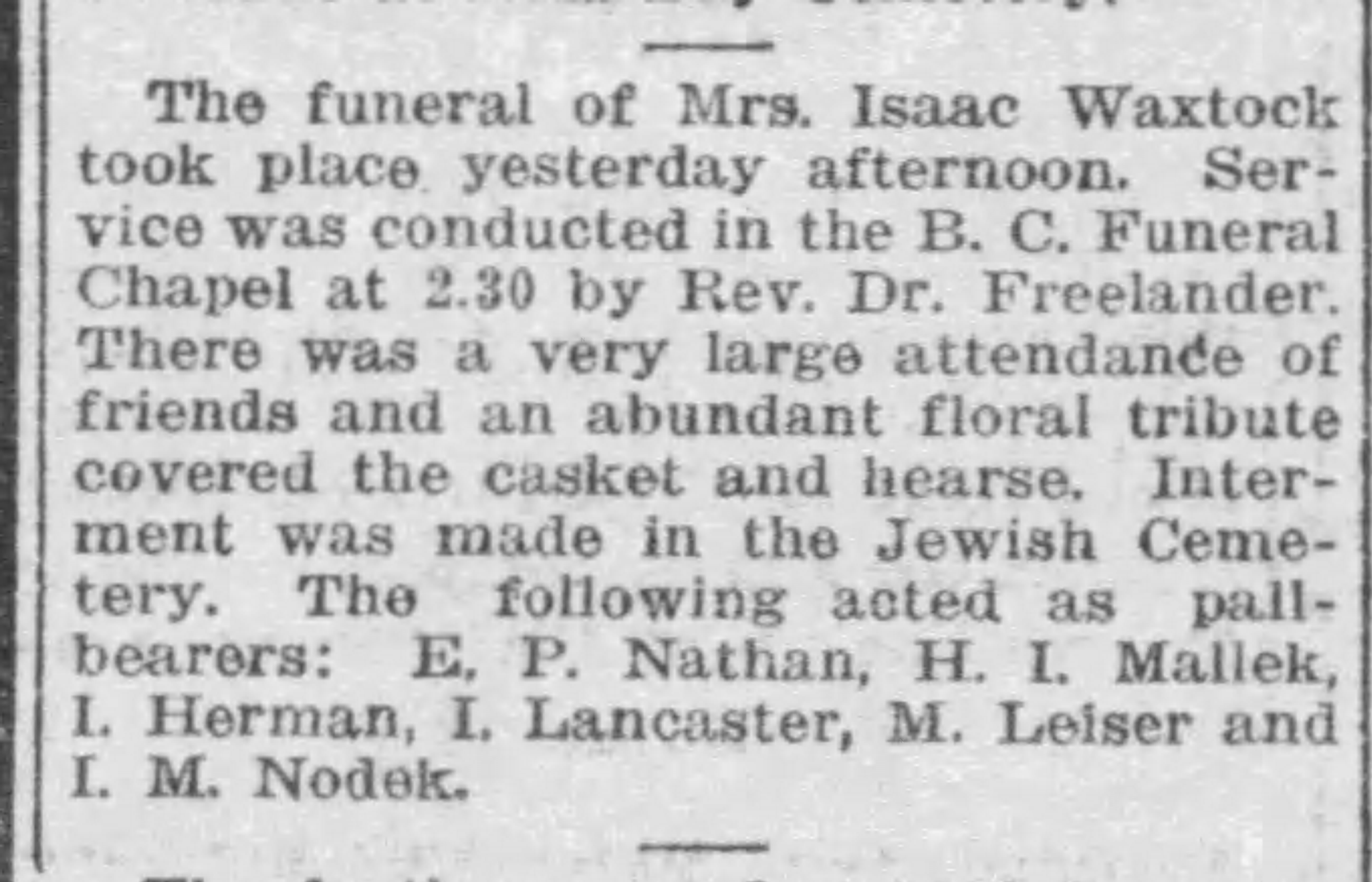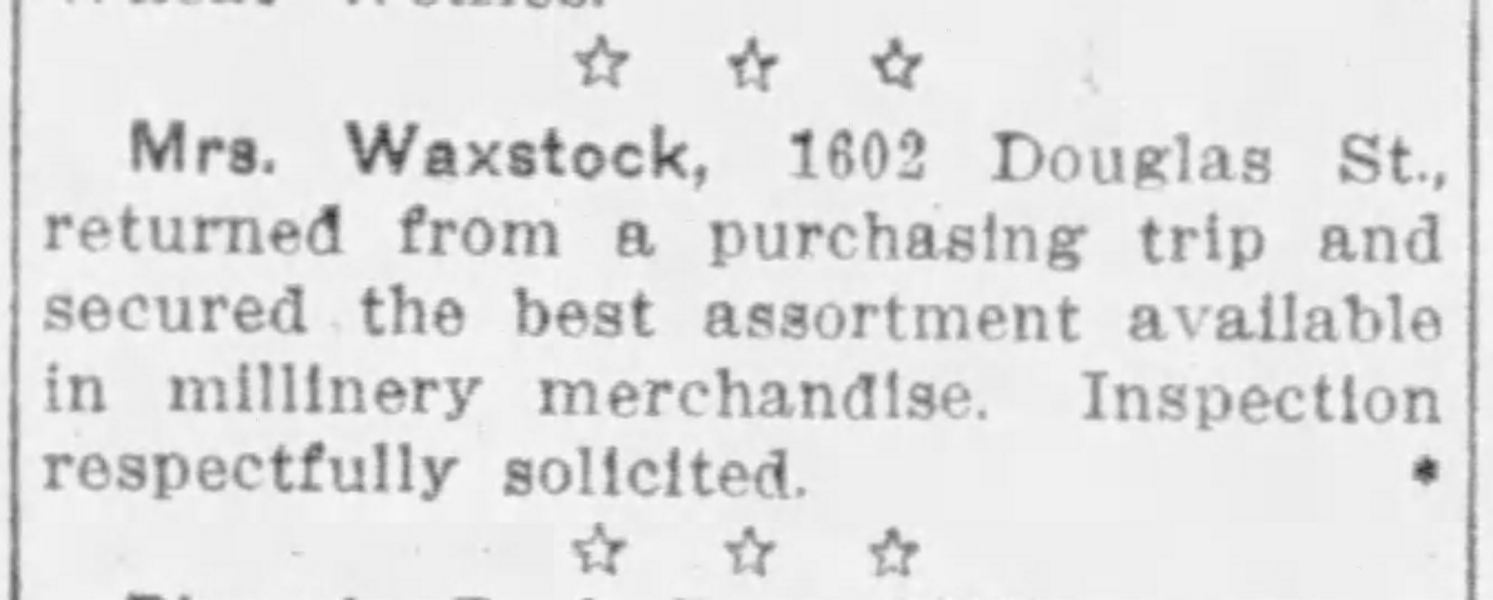 A few article referred to a Miss Waxstock performing at different event. The Evening Post on November 11, 1909 said that Miss Waxstock would be singing duets with Miss McGregor and Miss Wilson. Mr. and Miss Waxstock were scheduled to participate in a fundraising social for the Ladies Aid of the First Congregational Church held in June 1912.