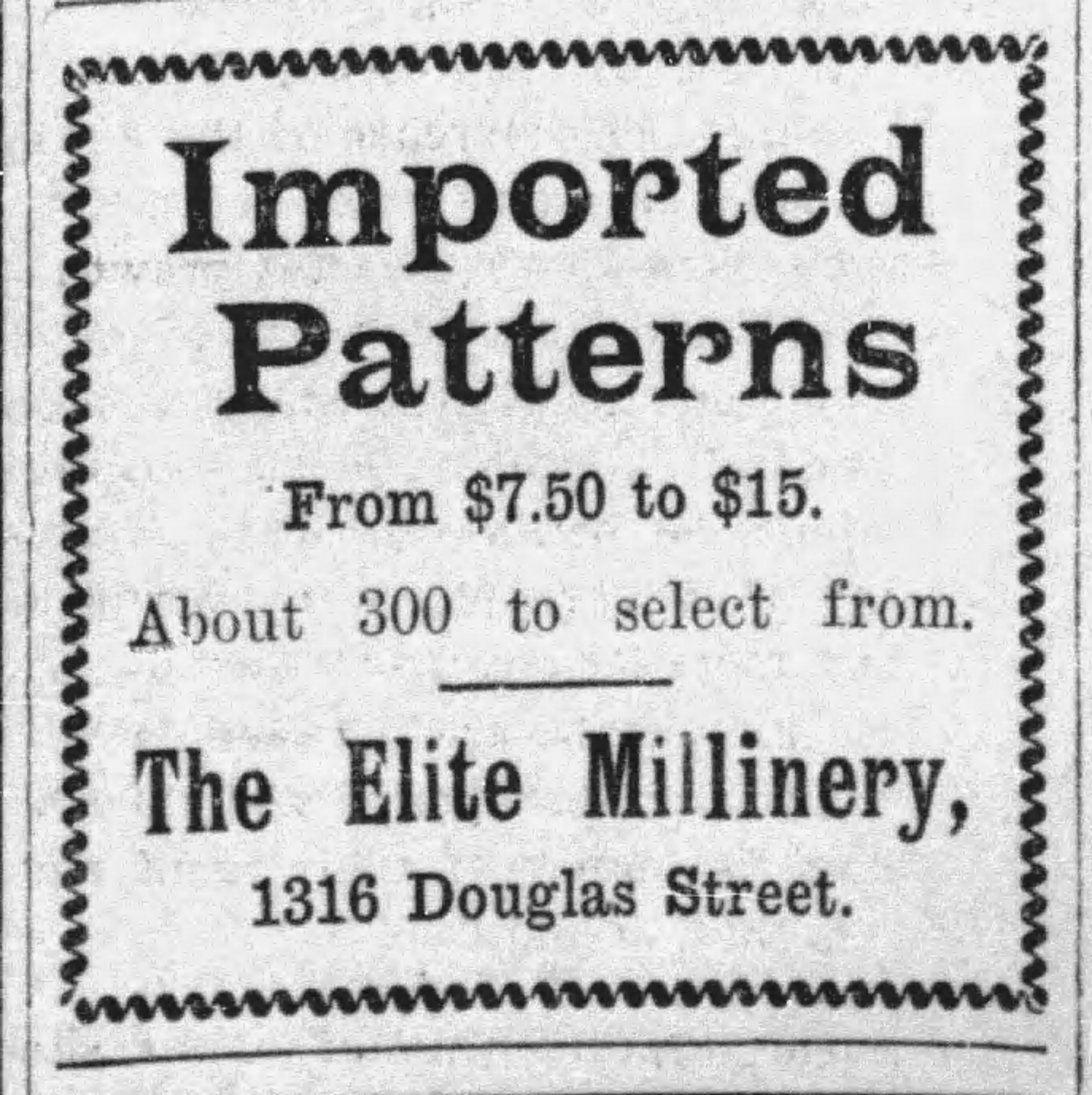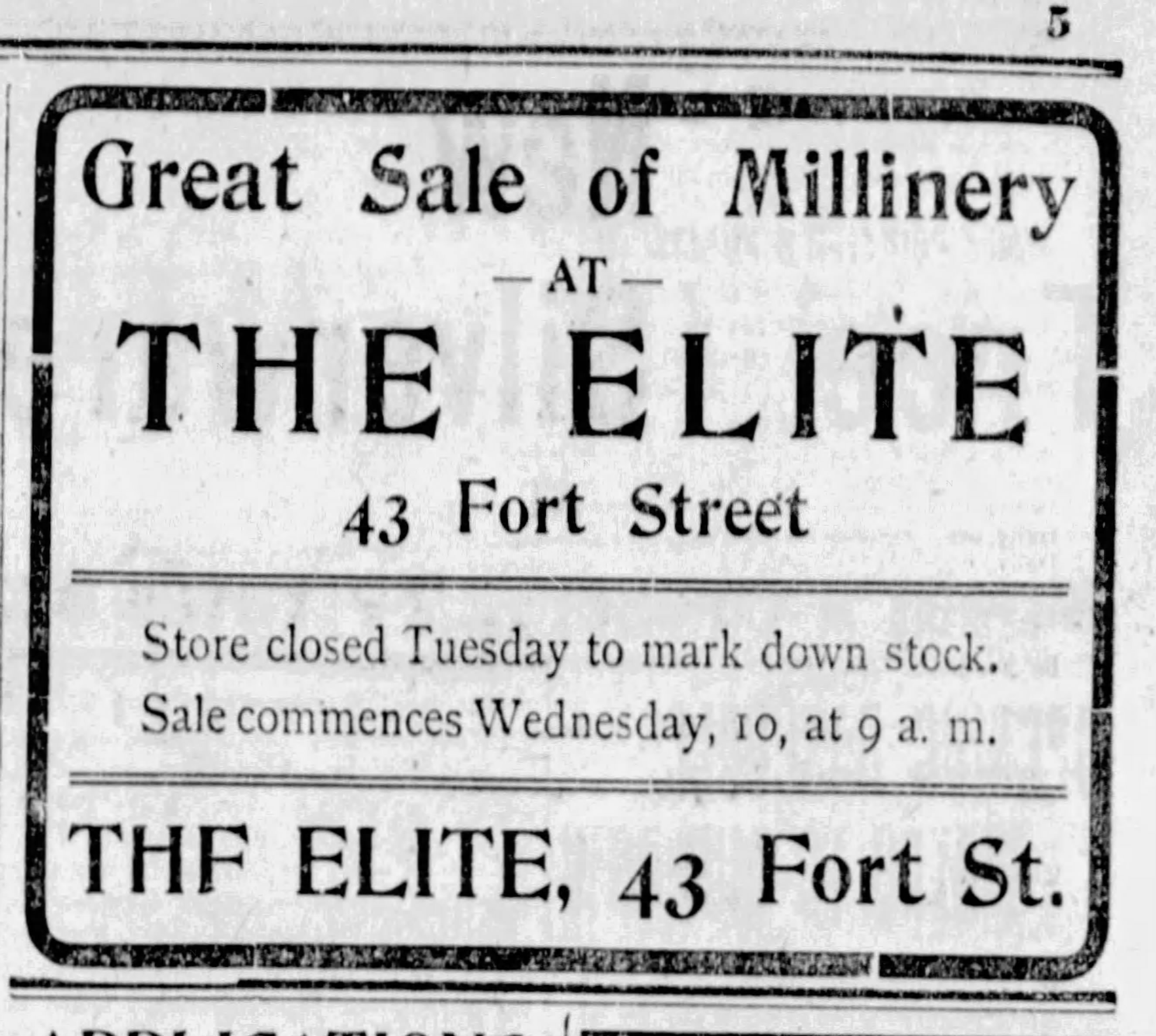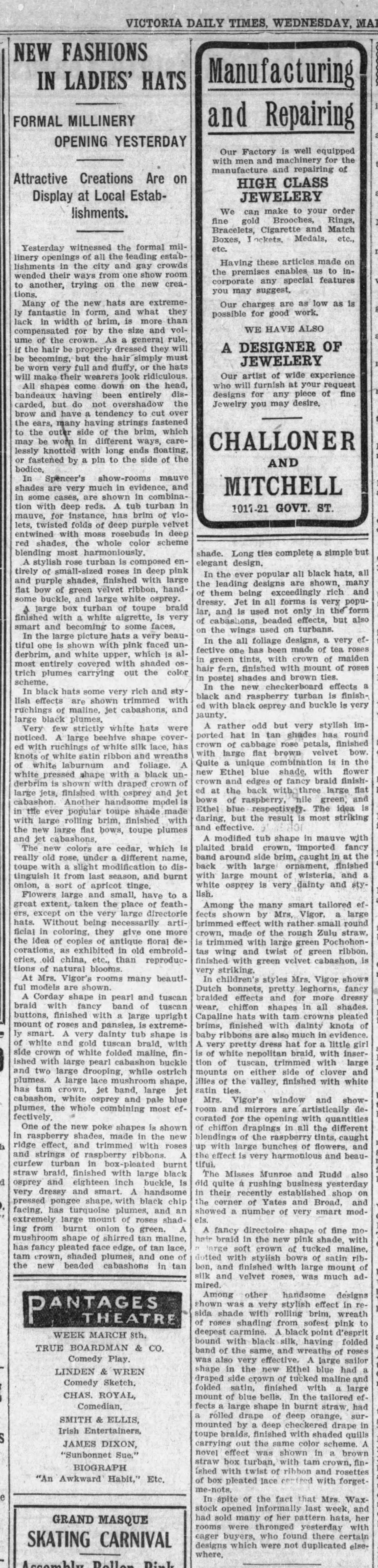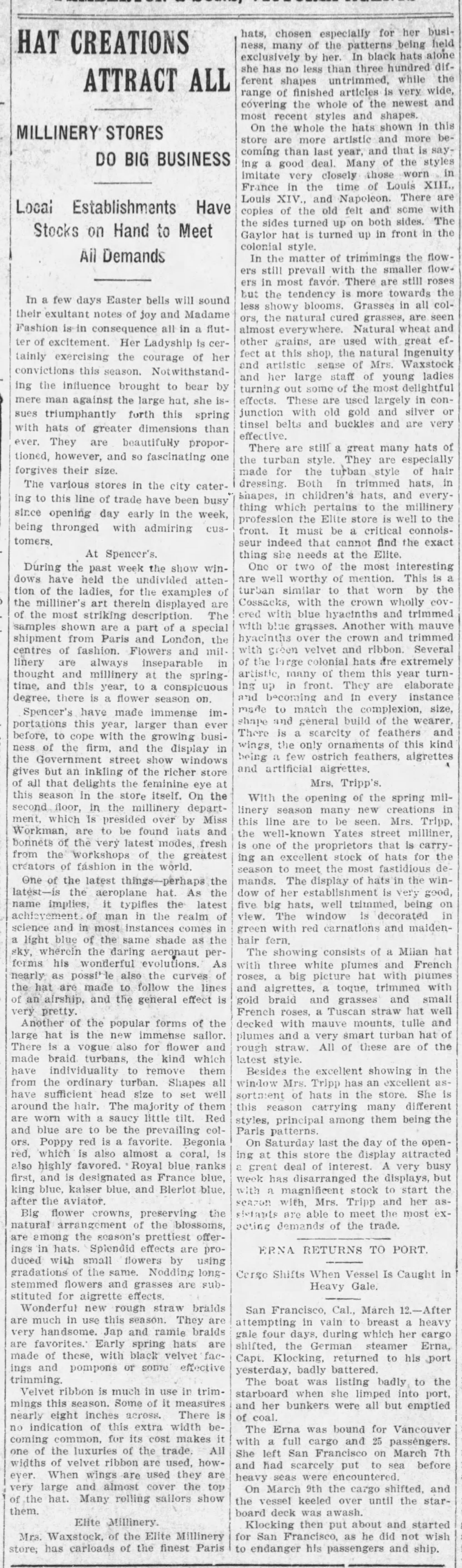 The Victoria Daily Times reported on March 5, 1909 that Elite Millinery on Douglas Street displayed “about 250 models with prices to suit all purses, and exclusive designs to suit the most fastidious.” The article went on to say: “A great many Paris hats are shown, which display all the chicness and daintiness for which that centre of fashion is famous.” Other details can be found in the article which is posted above.