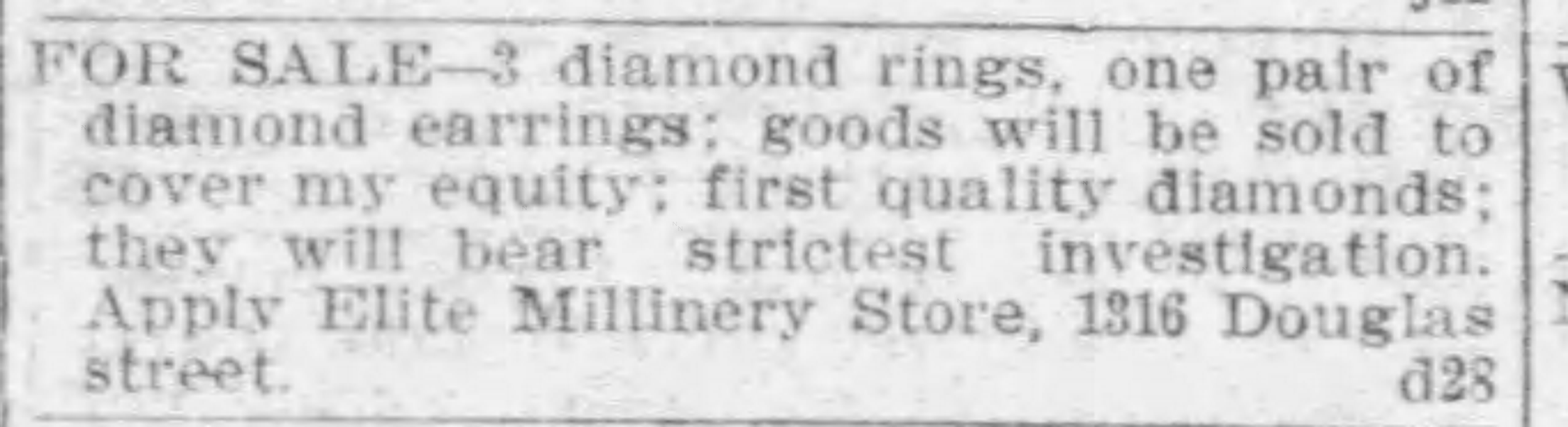 FOR SALE- 3 diamond rings, one pair of diamond earrings; goods will be sold to cover my equity; first quality diamonds; they will bear strictest investigation. Apply Elite Millinery Store 1316 Douglas Street