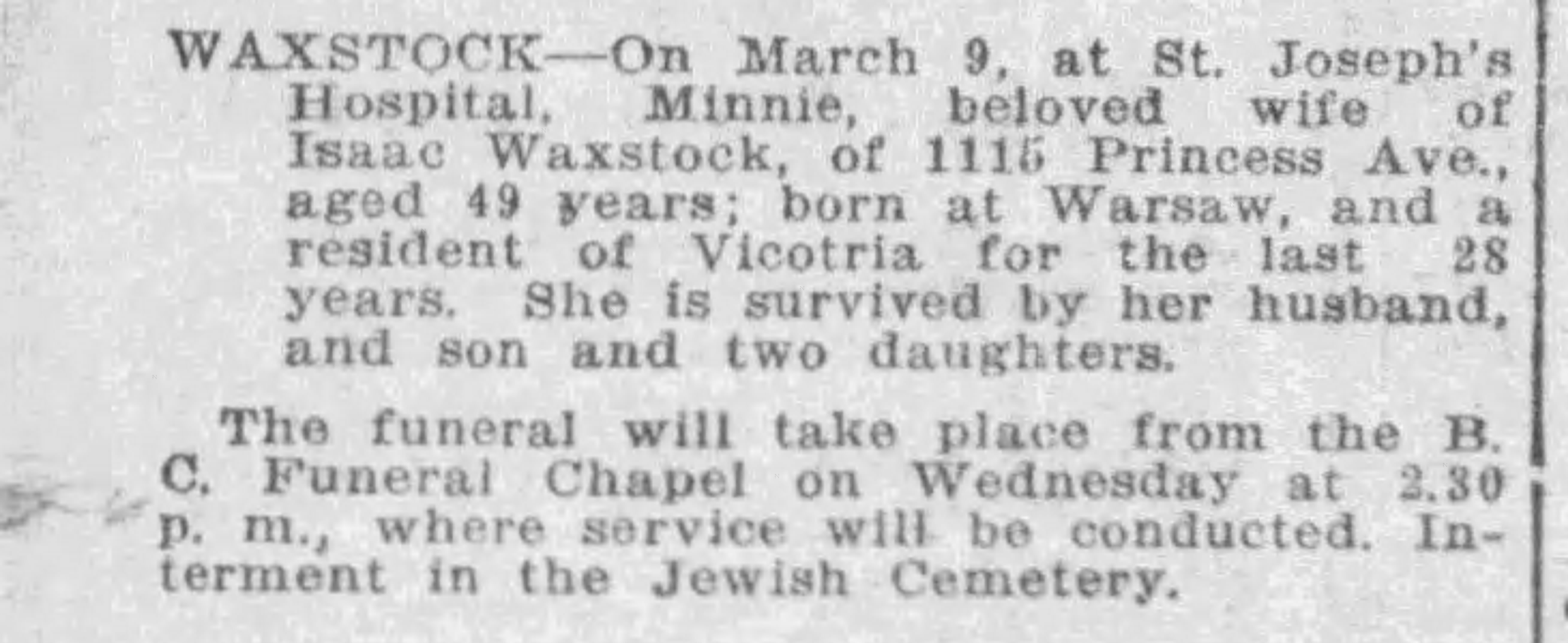 After her death, The Victoria Daily Colonist of October 1, 1921 published a notice of the lots for that would be auctioned for unpaid taxes. That included Lot 5 in the Malahat District in the name of Mrs. I. Waxstock (Est).