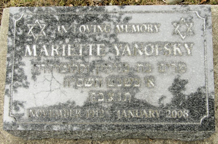 Mariette Yanofsky Birth: Nov 1912 Death: Jan 2008 Plot: South Zone – Plot 58 Inscription:In Loving MemoryMARIETTE YANOFSKYמרים בת בנימין וקלוטילדהא׳ בשבט תשס׳׳חת נ צ ב הNovember 1912 – January 2008